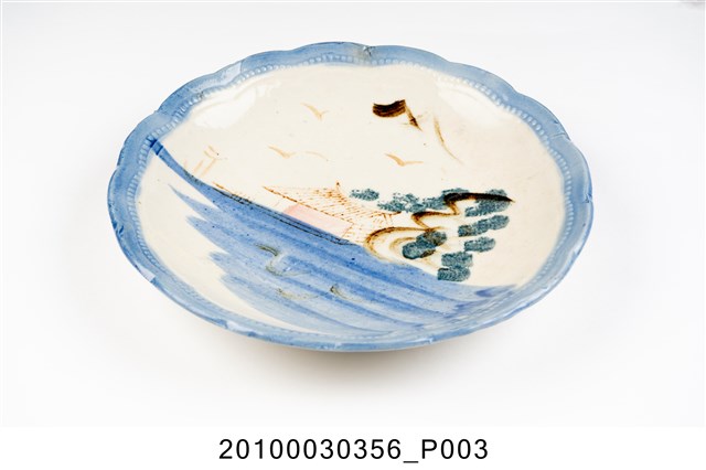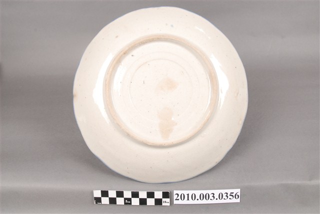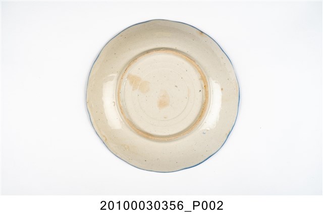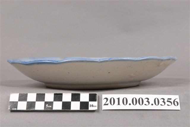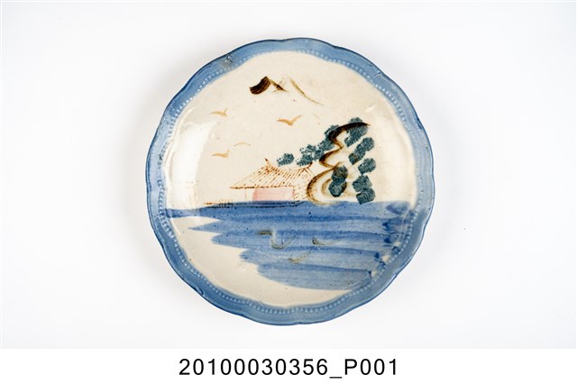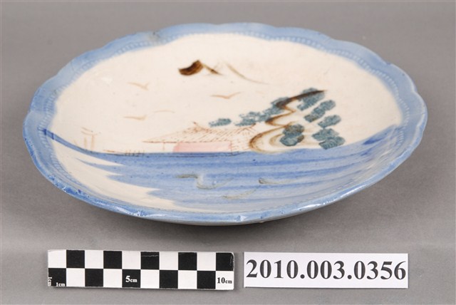 手繪池塘人家圖花口盤為高溫燒製且模具成形,圓唇,口沿微微外敞,淺圓腹,斜壁下斂至圈足,矮圈足,圈足內壓印雙圈紋,平底刮釉露胎。胎體白中帶黃,通器滿施透明釉,呈色瑩潤。盤外壁有流釉現象,器面多有雜質沈澱,以及釉面不平整的狀況。口沿處施罩一圈鈷藍釉彩,發色較淡且均勻,並模印有一圈連珠紋。盤外壁素面無紋,主要紋飾繪於盤中央,以一磚造房屋為主體,並以鈷藍釉描繪位於房屋前方大片的水塘,另描繪屋旁的樹木、飛鳥以及遠山等作點綴。紋樣中的建築物可見臺灣傳統建築的特色:鴟尾、紅磚造的低矮建築物。臺灣早期房屋前方有池塘,後面有院子,是十分道地的臺灣民間日常寫照,反映了臺灣瓷器選取的題材多以貼近民眾生活為主。