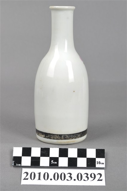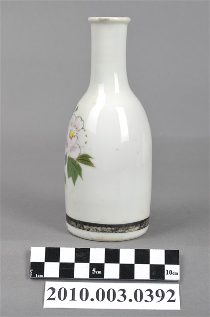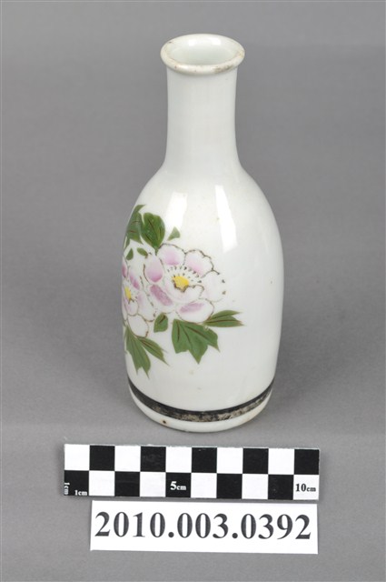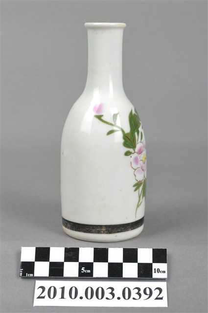 1. 白瓷轉印粉紅綠彩細頸瓶高溫燒造,胎質細密,釉色透亮。小圓口,圓唇,細長頸,豐肩,長腹,下收至器底,平底。全器內外施白釉,呈色乳白濃郁。紋飾僅繪於器腹,以兩朵盛開的花朵結組而成,用色用筆淡雅清秀。花朵以淺褐色釉描繪輪廓,再以粉紅色釉、黃色釉填彩,是以線條為主的表現手法。葉片則以色彩為主,沒有描邊,再以淺褐色釉繪出葉脈。器腹下方則以深褐色釉繪一圈裝飾帶。其餘器腹留白,紋飾重點皆放在花草紋上,構圖簡單大方。