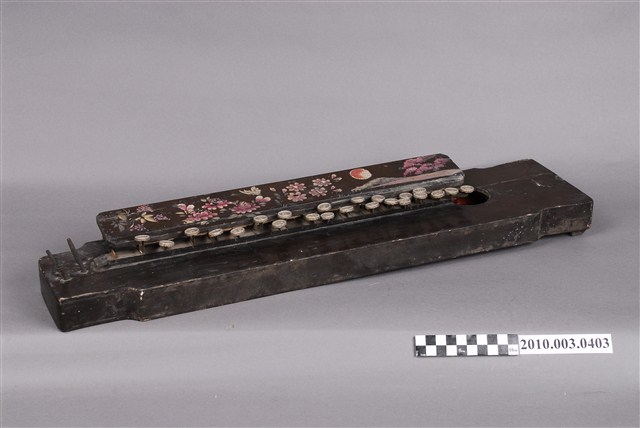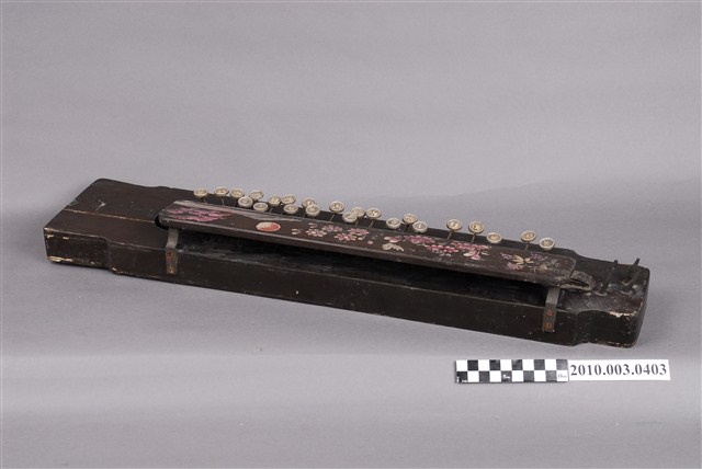 1.本物件為中山琴,材質為木頭與金屬,按鍵部分印有黑底白色的數字,按鍵上方木頭部分刻有圖案「粉色花朵、樹、山、水、月亮」,圖案略有斑駁,位於中山琴中央的琴弦已斷裂。 2.中山琴,又稱大正琴,為日本大正時期所發明,有古箏的弦,又有西樂的鍵盤,容易演奏,且聲音清脆優美,適合一般演奏娛樂與彈唱使用。