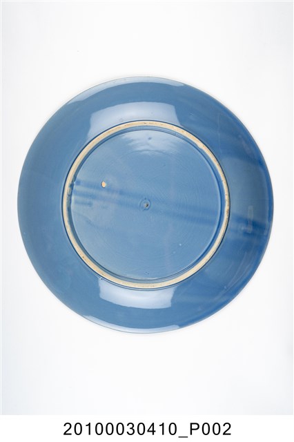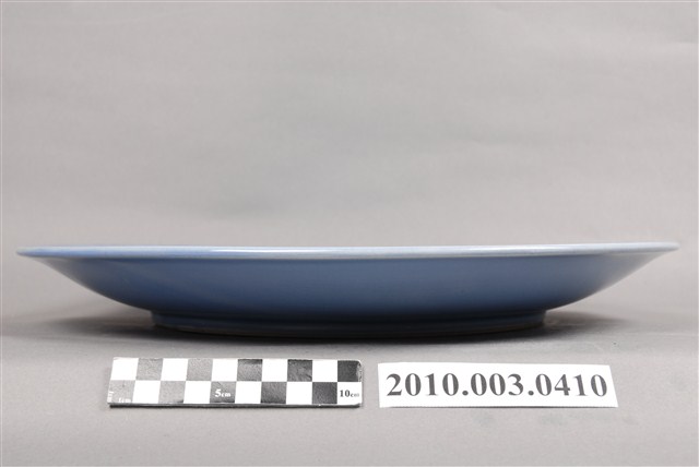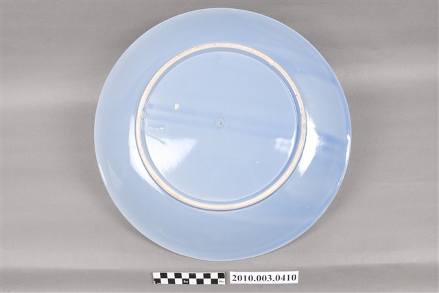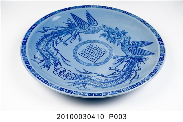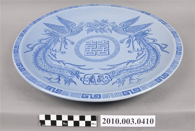 鈷藍釉印花雙鳳紋圓盤為白陶質,以覆鏇壓法製作,圓唇,口沿外侈,略作窄折沿,寬圓腹,略深,弧壁下收至圈足,矮圈足,圈足徑大,約為口徑之一半,平底刮釉露胎。全器施化妝土後滿施透明釉,釉面潤澤,器表有些許因高溫燒導致的氣孔與雜質沈澱。器外壁素面無紋,通壁施鈷藍釉彩,成色不均,且有流釉現象。紋飾集中於盤面與折沿處。折沿壓印雙頭回字紋飾,以一粗一細兩種款式做間隔裝飾。主要紋飾繪於盤心,為轉寫而成,以藍色釉轉印兩兩相對的展翅鳳鳥,鳥首昂然,尾羽羽翼豐厚。兩隻鳳之間繪有兩朵盛開的玫瑰花。盤心以雙頭回紋作圈狀紋飾,內書一「囍」字,下方有一如意紋,中間印有字樣,應是「長壽」兩字。盤面施罩鈷藍釉,青花發色均勻,為一件帶有賀喜作用的陶瓷器。