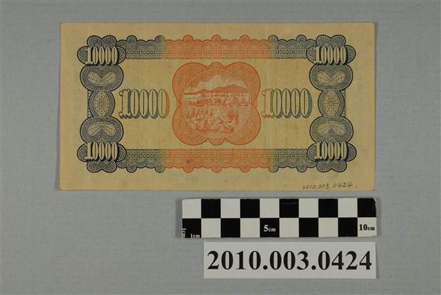 1.本物件為1948年臺灣銀行第一印刷印製廠印製的臺幣壹萬圓鈔券。以深綠色為主墨色,採橫式印製,長8.7公分,寬16.2公分,正面為單色凹版印刷,背面為凸版配平面底紋印刷。鈔票正面由幾何花紋構成鈔票圖案的方框,方框左上、右上兩角由右而左書寫「壹萬」兩字,左下、右下兩角則是由上而下書寫「壹萬圓」3字。方框內部上側左、右兩邊各印有紅色「BF452682」編號,中間由右至左書寫「台灣銀行」等4字。方框內中間右側繪製臺灣地圖,臺灣地圖右上方書寫「台」字,左上邊書寫「幣」字,臺灣地圖圖案由上而下覆蓋「壹萬圓」3字。中間左側繪製臺灣銀行總行建築。正中央繪製孫文肖像,肖像下方由右至左書寫「中華民國三十七年印」等9字。方框內下邊以花紋為底圖,花紋底圖右方為臺灣銀行董事長戳章,左方為臺灣銀行總經理戳章。方框下邊線左、右兩邊各覆繪1個扁方框,方框內由右而左書寫「壹萬」兩字。方框邊界外下方中央由右而左書寫「第一印刷廠」等5字。鈔票背面以藍色、橘色為主色印製波浪型幾何花紋方框,方框四角各正寫「10000」數字,中央印製橘色圓形框,圓框內印鄭成功與荷蘭的海戰圖,圓框外圍以橘色幾何底紋圖案。圓框兩側至方框線中間,各書寫「10000」數字。2.戰後初期臺灣省行政長官公署成立後,原暫時讓日治時期發行的臺灣銀行券流通,1946年6月,國民政府才正式授權臺灣銀行發行鈔券,並在5月22日委託中央印製廠上海廠印製壹圓、伍圓、拾圓等3種面額鈔券,再分批運來臺灣,9月1日,臺灣銀行再發行伍拾圓、壹百圓兩種面額紙鈔,仍委託中央印製廠製作。1948年,受到國共戰爭導致通貨膨脹的影響,臺灣銀行開始印製高面額鈔券,又因原委託印製鈔券的上海印刷廠正趕印中國大陸所需鈔券,無暇充分供應臺灣所需,故部分改由位於臺北之臺灣銀行所屬第一印刷廠印製鈔券。本物件壹萬圓面額鈔券,即由第一印刷廠印製,於1948年12月11日發行。由於1949年臺灣省政府實行幣制改革,發行新臺幣,前此發行的貨幣於1950年1月14日正式停止流通。相較於新臺幣,幣制改革前發行的貨幣則慣稱為舊臺幣。