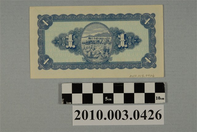 1.本物件為1946年臺灣銀行委託中央印製廠印製的臺幣壹圓鈔券。以藍色為主墨色,採橫式印製,長7公分,寬12.9公分。鈔券由幾何花紋構成鈔票圖案的方框,方框右上、左上兩角各以楷書斜寫「壹」字;右下、左下兩角各以楷書正寫「壹」字。右方以幾何花紋、「壹圓」文字為底紋,底紋上繪製臺灣地圖,臺灣地圖上方由右而左書寫「台幣」兩字,臺灣地圖圖案由上而下覆蓋「壹圓」兩字。左方則繪製臺灣銀行總行建築,圖案上方有紅色「AA534639」編號。中央繪製孫文肖像,肖像上方由右至左書寫「台灣銀行」等4字,肖像下方由右至左書寫「中華民國三十五年印」等9字,肖像右下方為臺灣銀行董事長戳章,左下方為臺灣銀行總經理戳章。方框邊界外下方中央由右而左書寫「中央印製廠」等5字。背面印製波浪型幾何花紋方框,方框四角各斜寫「1」數字,中央印製點狀直式橢圓形框,橢圓框內印鄭成功與荷蘭的海戰圖。橢圓框兩側各繪製略呈90度三角形幾何花紋底圖,底圖覆寫「1」數字。2.戰後初期臺灣省行政長官公署成立後,原暫時讓日治時期發行的臺灣銀行券流通,1946年6月,國民政府才正式授權臺灣銀行發行鈔券,初期僅發行壹圓、伍圓、拾圓等3種面額,並委託中央印製廠上海廠印製,再分批運來臺灣。由於1949年臺灣省政府實行幣制改革,發行新臺幣,前此發行的貨幣於1950年1月14日正式停止流通。相較於新臺幣,幣制改革前發行的貨幣則慣稱為舊臺幣。