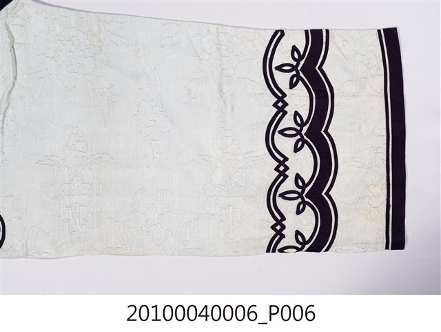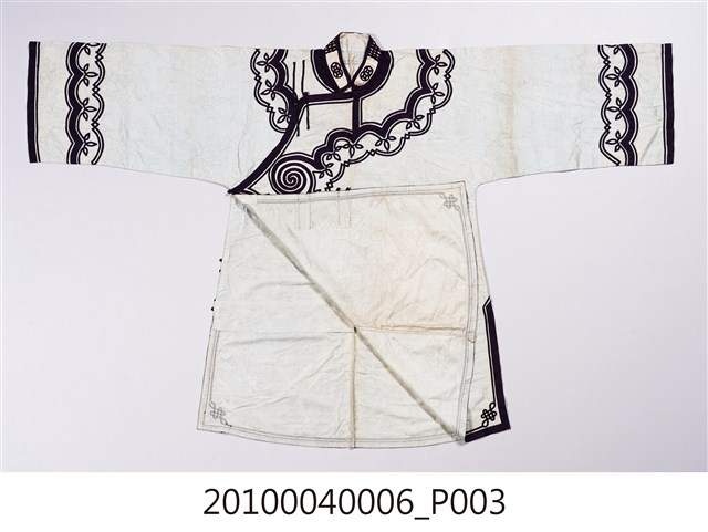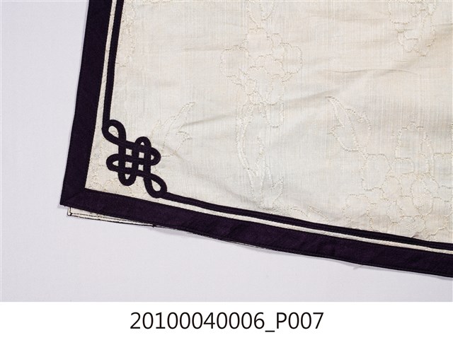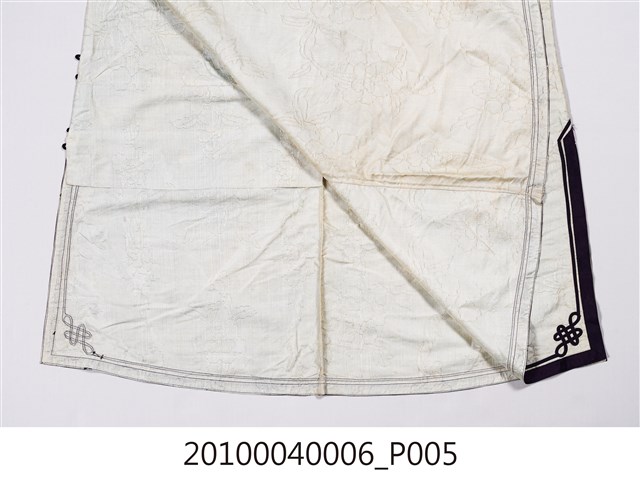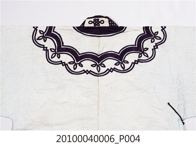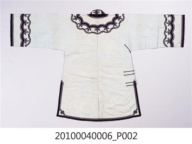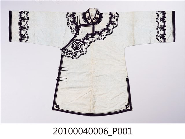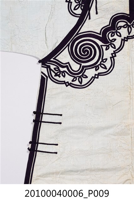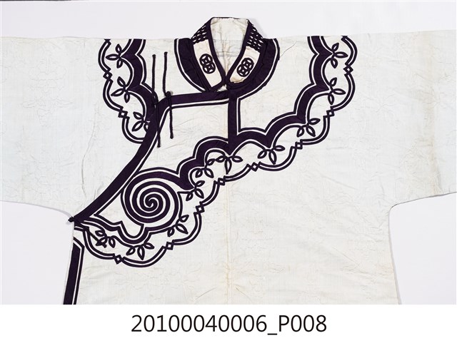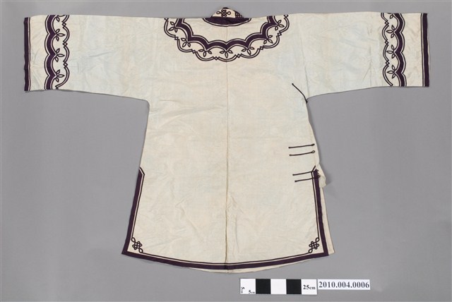 此大襟衫衣身以米白色絲質緹花材料為底布,搭配深紫色布料做鑲緄緣邊,領緣、大襟、脇邊開衩、下襬、袖管和袖口皆做寬窄大小不一的鑲緄,以及牙子配飾,並在前後衣襬四個角落做盤長紋四關鑲圖案裝飾。衣領為小立領,領子上以紫色配布做雙銅錢紋裝飾,大襟末端做漩渦雲頭紋,搭配牙子連續波浪紋式,使襟頭裝飾顯得精緻而華麗。整件服裝共有8對直布扣,領口一對,大襟兩對,腋下一對,脇邊四對,紐條用布和鑲緄配布相呼應,整件服裝顯現清新優雅的風姿,應是年輕婦女的禮服。