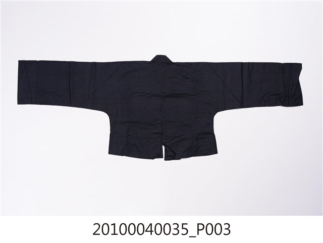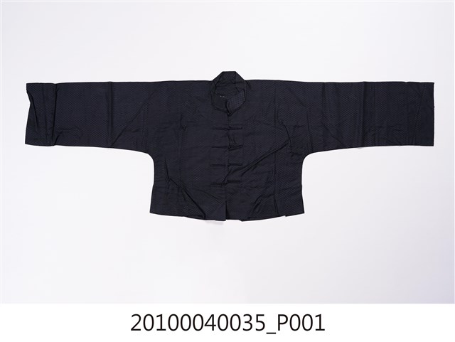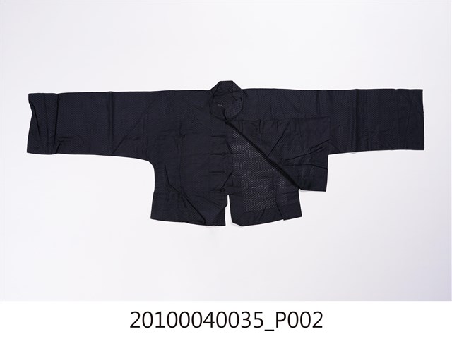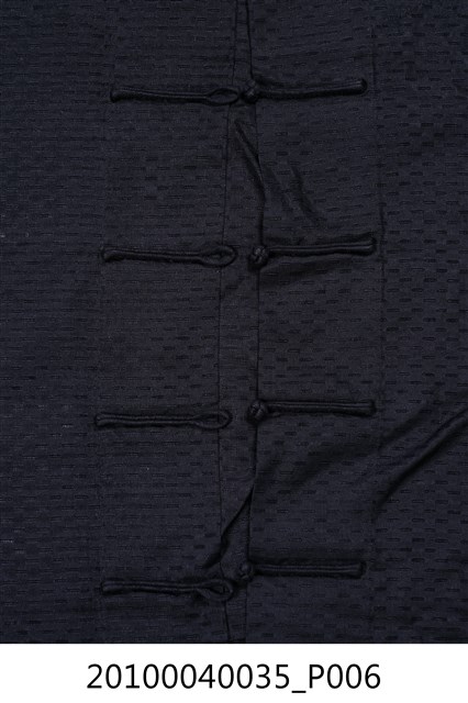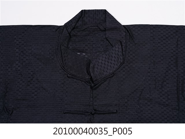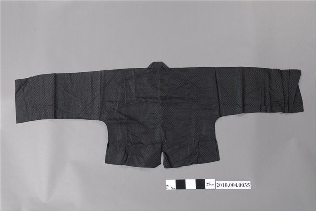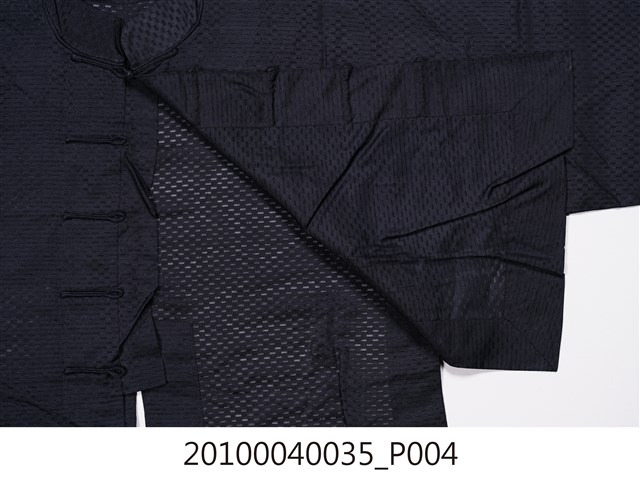 1.此外褂表以黑色紗羅組織的布料製作,立領、前開對襟,前襟上有五對直布扣,以布結紐頭做扣合。後中和左右兩側下方都有開衩,領子後中處有一黑袢環,可作為吊掛服裝時使用。2.紗羅是採用絞經組織的透孔織物,經紗相互絞纏後呈現椒孔狀,即所謂「椒孔曰羅」;根據花紋又可分為花羅與素羅,常用作為夏季或春秋之際的衣料。本件服裝屬於夏季的素羅,屬於夏季的透氣高級禮服。