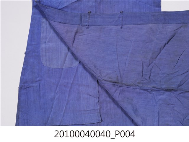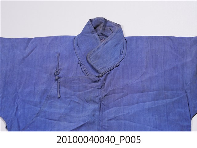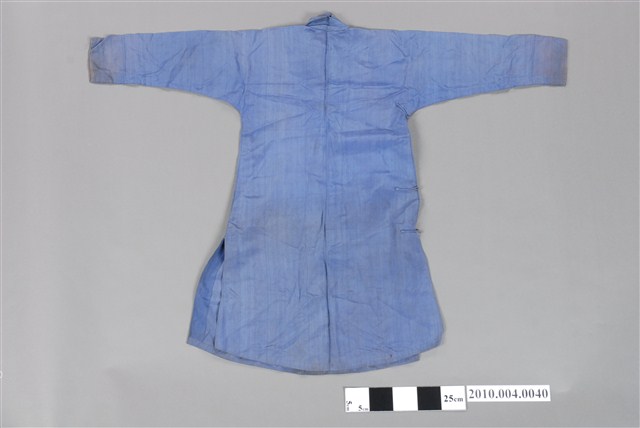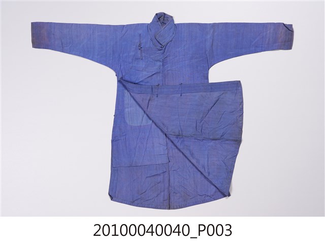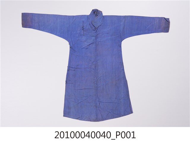 1.此服裝為立領長袖大襟男長袍,表布以藍色棉布製作,裡布則為同色系的薄棉布,右開大襟,領口、大襟和脇邊綴有五對直布扣,衣身修長、袖管細窄,似乎是日常生活穿著的服飾。2.長袍在臺灣早期或稱為長衫,與馬褂合稱「長衫馬褂」或「長袍馬褂」屬於男子的禮服之一,也是文人雅士較常穿著的服式,一般勞動者為了活動方便穿著短的對襟衫和大襠褲,教書先生、掌櫃、文職工作者則多以長袍為日常服飾穿著。