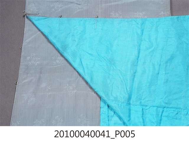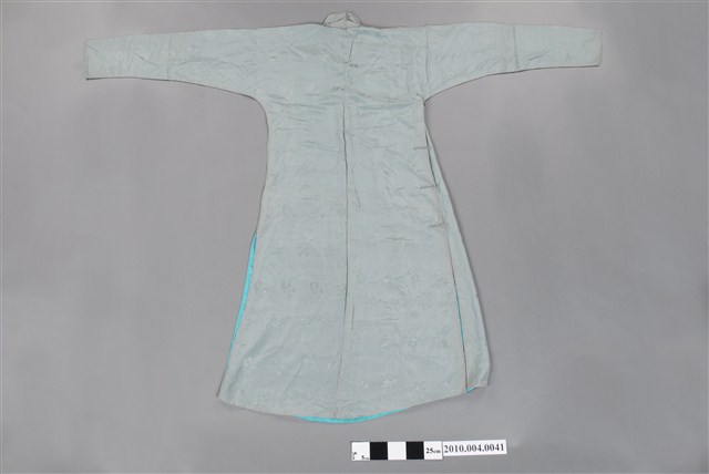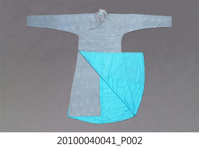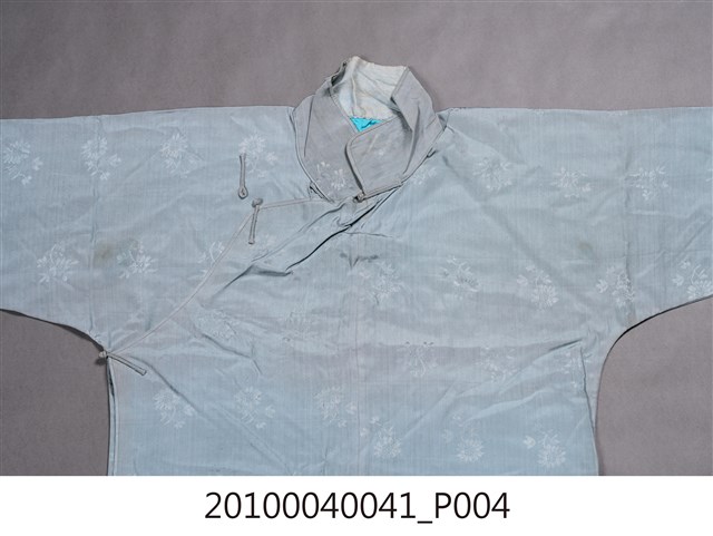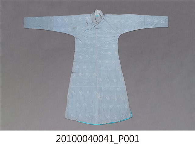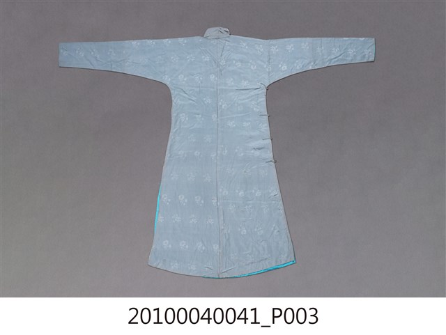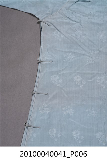 1.此服裝為雙層布料製作,表布為淺藍色絲質緹花布料,內裡是藍色絲料,表布緹花為折枝花卉暗紋,衣身修長、袖管細窄,服裝領子、大襟和脇邊有六對直布扣。衣身前後中心皆有剪接線, 加上內襟形成前後左右以及內襟,共有五襟齊長的「五世齊昌」美好寓意。立領的作法是先以本布鑲緄領緣後,再將立領綴縫上去,領緣、大襟、袖口、脇邊和開衩部位,均以本布做細窄的鑲緄收邊,做工細緻優美。2.長袍在臺灣早期或稱為長衫,與馬褂合稱「長衫馬褂」或「長袍馬褂」,屬於男子的禮服之一,也是文人雅士較常穿著的服式,一般勞動者為了活動方便穿著短的對襟衫和大襠褲,教書先生、掌櫃、文職工作者則多以長袍為日常服飾穿著。