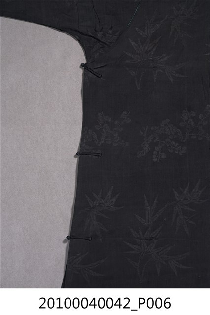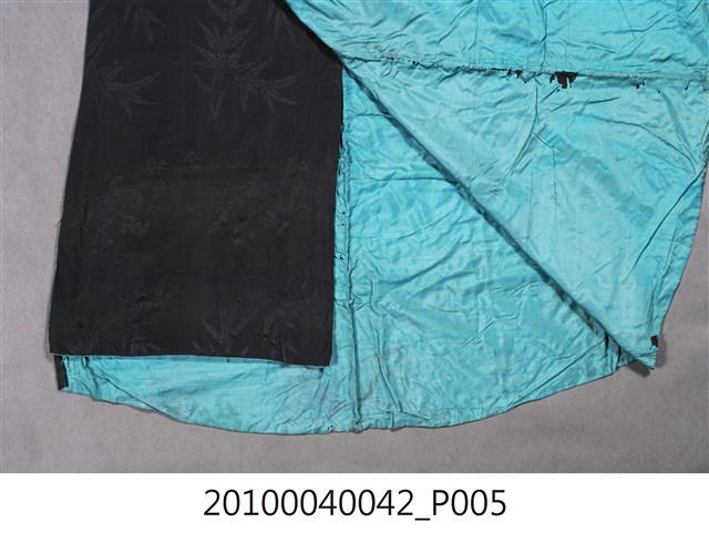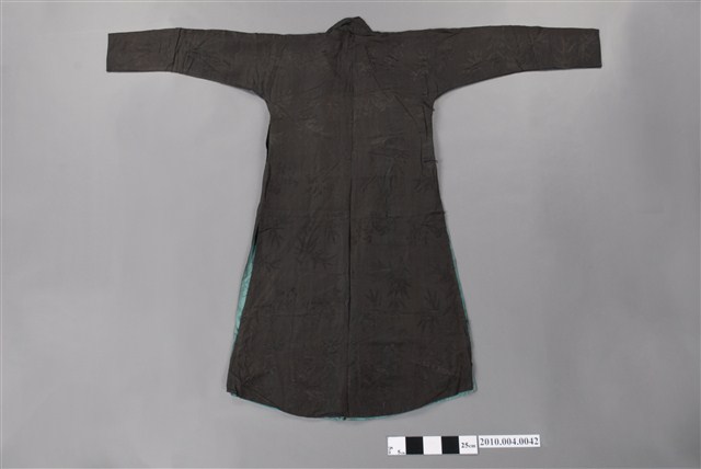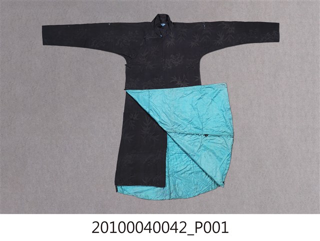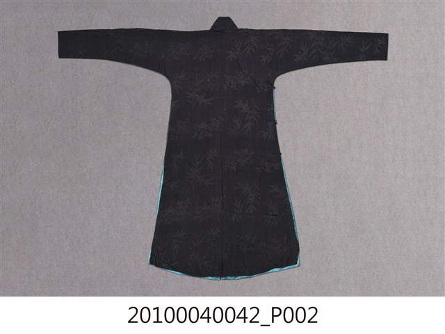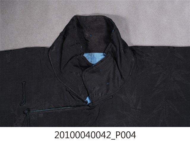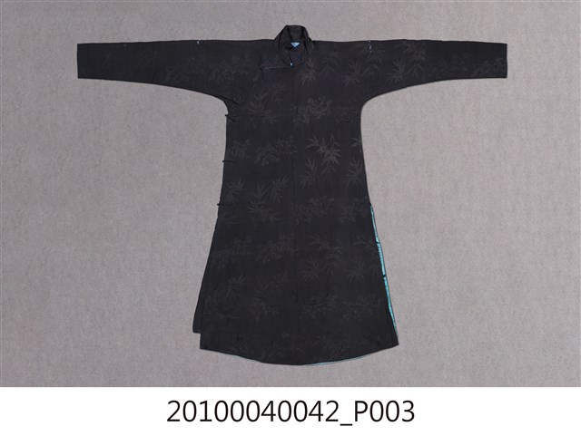 1.此服裝為雙層布料製作,表布為黑色絲質暗紋緹花布料,內裡是藍色布料,表布緹花為折枝梅花和竹枝暗紋,象徵高潔風雅;服裝輪廓修長、袖管細窄,領子略高,在頷下、大襟和脇邊有五對直布扣。衣身前後中心皆有剪接線, 加上內襟形成前後左右以及內襟,共有五襟齊長的「五世齊昌」美好寓意。立領的作法是先以本布鑲緄領緣後,再將立領綴縫上去,因此領子接縫處會出現如出芽的邊條。另外,領緣、大襟、袖口,均以本布做細窄的鑲緄收邊,細緻而優美。2.長袍在臺灣早期或稱為長衫,與馬褂合稱「長衫馬褂」或「長袍馬褂」,屬於男子的禮服之一,也是文人雅士較常穿著的服式,一般勞動者為了活動方便穿著短的對襟衫和大襠褲,教書先生、掌櫃、文職工作者則多以長袍為日常服飾穿著。