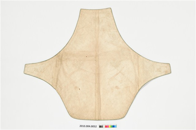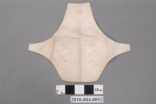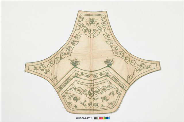1. 此件肚兜為下端略寬形,正反兩面均為米色,使用綠色線結邊,正反兩面均有污損。正面紋樣方面,主要使用辮繡,圍頸及四邊做雲紋邊框,並繡有蝙蝠、盆花、盤長,圍腹部分有雙口袋,繡有雲紋、兩隻瑞鶴、兩隻鹿,在圍腹上方兩側各繡有盆花。蝙蝠的蝠與福諧音,象徵福氣,瑞鶴與盤長有長壽之意,鹿則與祿諧音,此件肚兜表現福祿壽的吉祥意涵。本件肚兜乃新竹鄭氏家族文物,採用淺綠繡線,以及底部略窄、圓弧略平表現新竹地區的風格。2. 肚兜出現時間不會晚於漢代,隨時代形制、名稱均有改變,至清代開始稱作肚兜,臺灣也承襲此一名稱,別名還有抹胸、裹肚、兜兜等。臺灣肚兜通常先將紋樣繡於布片,再縫於肚兜上,裝飾安排上,紋樣多集中在下方口袋與緄邊,此兩點與中國地區肚兜有很大差別。另外,早期肚兜男女老幼都會使用,口袋部分有時會放置香料或藥材,可見肚兜還有香囊以及藥療的功能。