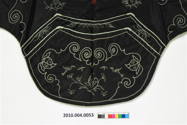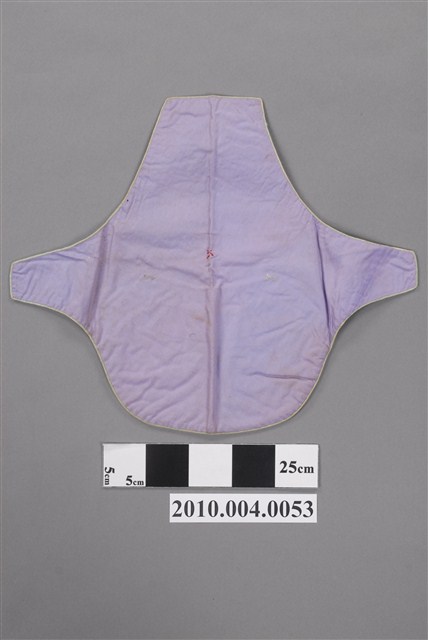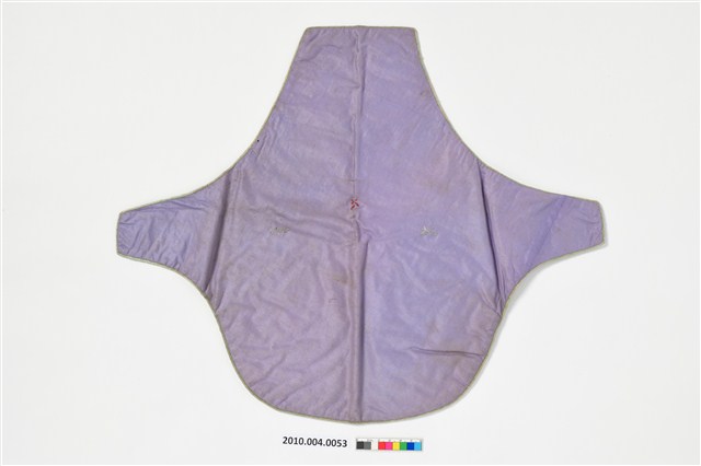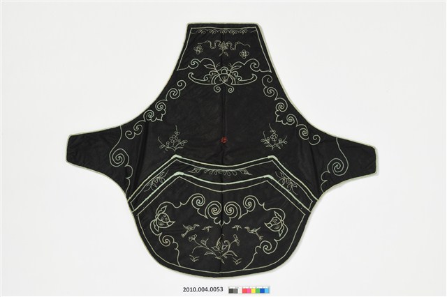 1. 此件為下端略寬形肚兜,圓底,為新竹地區風格,正面為黑布,背面為紫色棉布,可看出些許正面紋樣的繡線痕跡,並且有些污漬,無綁帶。刺繡技法方面主要為鎖繡。紋樣方面,圍頸部分以蝶紋做邊框,裡面繡方勝紋、花卉紋,肚兜兩側繡如意雲紋,圍腹部分繡纏枝牡丹以及相對的兩隻吉鳥,圍腹上方兩側繡有花卉,肚兜中央以紅線繡卍字紋。方勝寓意無窮,牡丹表示富貴,吉鳥代表吉祥,此肚兜寓意無窮的富貴吉祥。此件肚兜下端略窄、底部稍平直的樣式流行於臺中、新竹、嘉義等地。2. 肚兜出現時間不會晚於漢代,隨時代形制、名稱均有改變,至清代開始稱作肚兜,臺灣也承襲此一名稱,別名還有抹胸、裹肚、兜兜等,雖然臺灣肚兜源自中國,但是臺灣肚兜通常先將紋樣繡於布片,再縫於肚兜上,裝飾安排上,紋樣多集中在下方口袋與緄邊,此兩點與中國地區肚兜有很大差別。另外,早期肚兜男女老幼都會使用,口袋部分有時會放置香料或藥材,可見肚兜還有香囊以及藥療的功能。