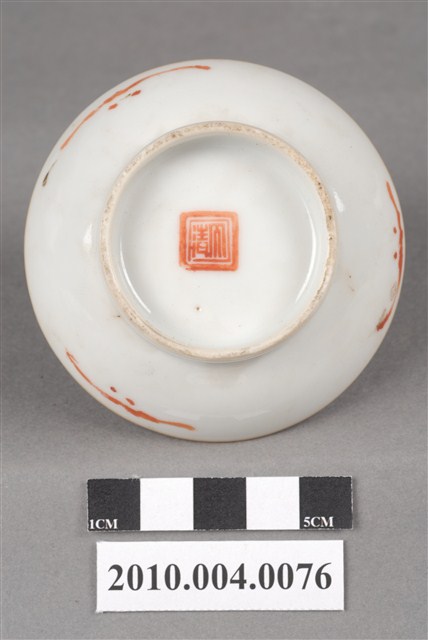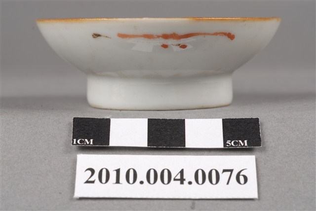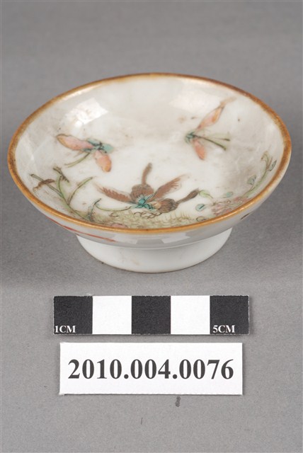 彩繪花草蝴蝶鑲金邊瓷盤,完整良好。鄭氏家族使用大陸進口瓷器組,杯底有「大清」篆體朱印字樣。