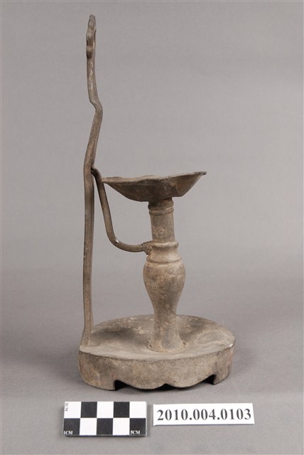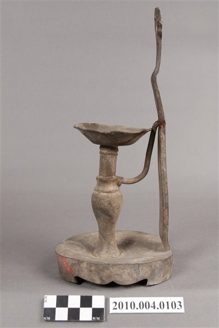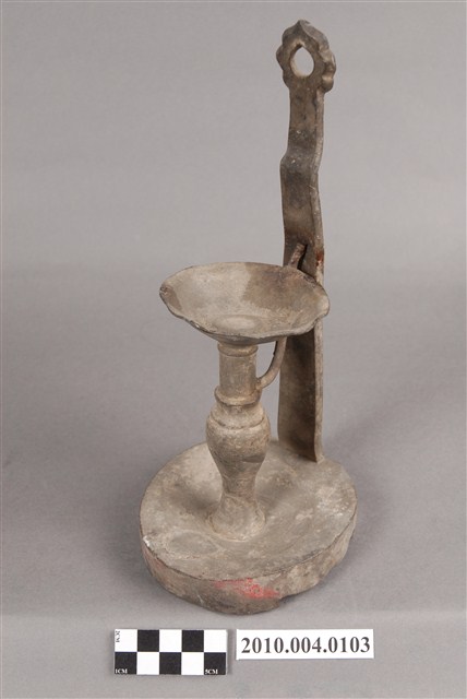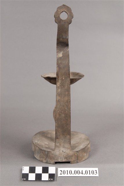 1.本件錫製壁掛式油燈為2承盤設計,可分為上下承盤、立柱與壁掛板。下承盤同為底座,呈圓形盤面,座身兩側底緣作矮扁M字形鏤空,呈3足腳裝飾。下承盤盤面略帶內凹,中心處立有圓柱,外型呈現長葫蘆狀。柱身後側另倒L形錫條與壁掛板接合,壁掛板呈長板狀,底端與底座焊合,頂端為尖狀雲朵外緣,中央帶有壁掛孔。立柱底端為上承盤,外觀呈現圓形碟狀,口緣處帶有花口造型。2.臺灣早期提供油燈的原料,為花生油、菜籽油等植物油,清末之後逐漸以石油提煉的礦物油煤油取代。自清代到日治時期,民生照明仍是以煤油燈為主,也有利用電土加水,產生乙炔燃燒的電土燈。電燈於日治前半期多為官方、商店、旅館使用,一般民眾大都使用煤油燈。於日治後期,隨著供電與電網的普及,電燈照明用具逐漸走入日常生活中。