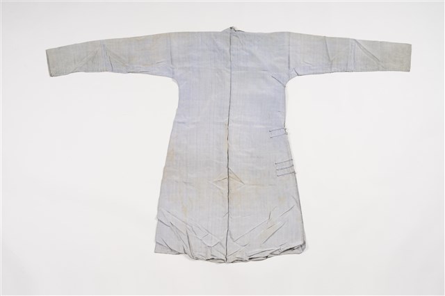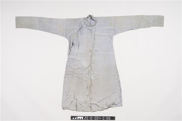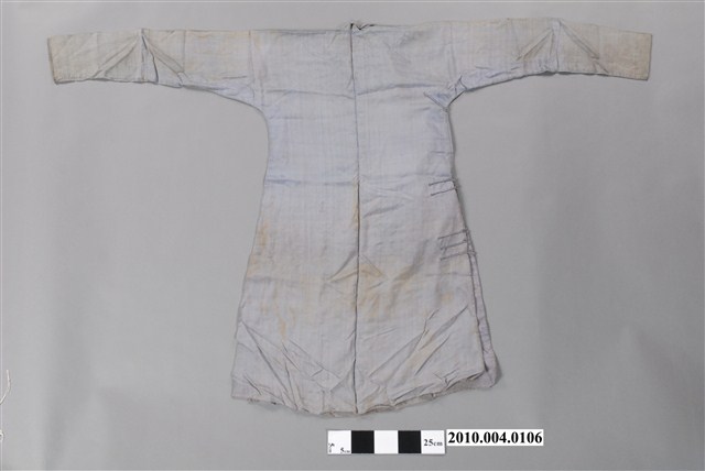 1.此服裝為淺藍色棉質布料製作,素色無紋飾;服裝輪廓修長、袖管細窄,領子前中心呈現圓滑柔和的弧度,並且有細細的出芽,在頷下、大襟和脇邊綴有九對長而細的直布扣,是使用斜布條包縫棉線製作而成的,美觀而細緻。立領的作法是先以本布鑲緄領緣後,再將立領綴縫上去,因此領子接縫處會出現如出芽的邊條,與立領外緣的芽條相呼應,作法細膩而美觀。2.長袍在臺灣早期或稱為長衫,與馬褂合稱「長衫馬褂」或「長袍馬褂」,屬於男子的禮服之一,也是文人雅士較常穿著的服式,一般勞動者為了活動方便穿著短的對襟衫和大襠褲,教書先生、掌櫃、文職工作者則多以長袍為日常服飾穿著,此件長袍色彩淺淡,且從尺寸大小判斷,可能是男童穿用的袍服。