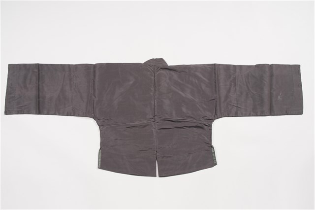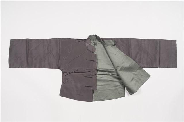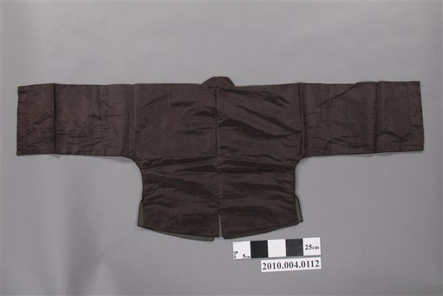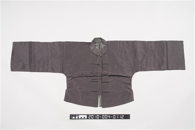 1.此短褂是雙層結構,表布以玄色(黑中帶紅)絲質緞布製作,裡襯為深灰色綿布,前後左右四開裾,頷下和對襟上共有五對直布扣,皆以布結纽頭做扣合,扣條細膩修長,其中第三對扣條似乎脫落,剩下殘存片段和綴縫的線跡。立領的製作是先做領緣緄邊後,再將立領綴縫上去,使領子和領緣出現一道細細的出芽,另外,右前襟底下綴縫有一條「裡襟」(或稱為小襟布),在晚清以前對襟的服裝大多沒有此種裝置,沒有裡襟的外掛一般稱為「單撳」,後來為了避免露出裡面的衣服才製作出有「裡襟」的對襟服裝。2.對襟外褂與長袍 (或長衫)合稱「長衫馬褂」或「長袍馬褂」屬於男子的禮服之一。民國十八年政府頒行長袍、馬褂為男子禮服形式,在臺灣傳統漢族男子也是以長袍馬褂為一般大眾的禮服,此服裝依照尺寸判斷,可能是男童之外褂。