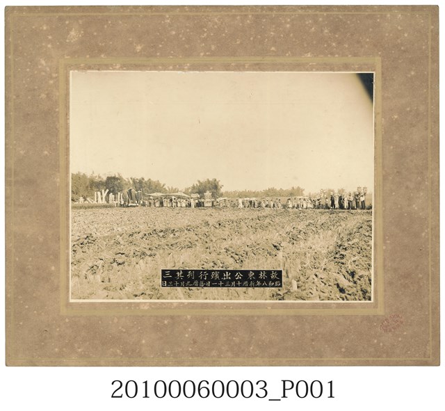 1.本物件為故林東公出殯行列其三照片,從照片中可看到出殯行列行經田埂及樹林,人群中有人手持出殯相關物品、傘、旗幟等。 2.林東為臺中仕紳,生於1862年,幼習漢學,從事農業及開墾,曾任臺中州烏日庄協議會員,歷任大小公職,信望殊高,為人溫順,鄉黨仰慕。