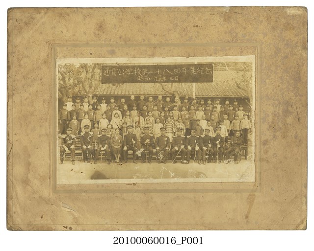本件為通霄公學校(苗栗縣通霄國民小學)第28屆畢業紀念照,拍攝時間為昭和9年(1934)3月,照片上方印有「通霄公学校第二十八回卒業紀念」、「昭和九年三月」字樣。