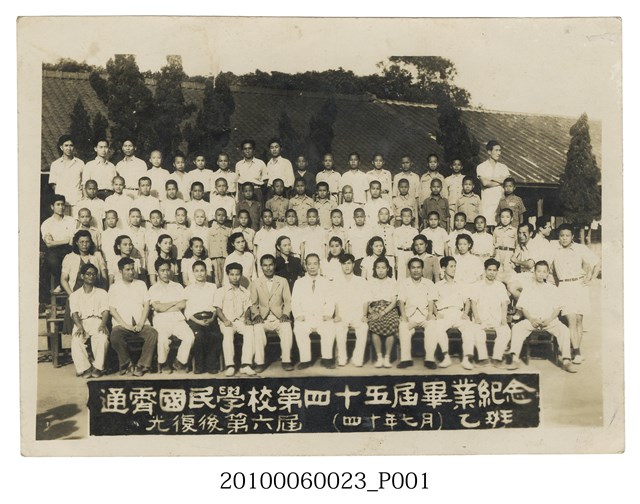 本件為苗栗縣通霄國民學校(今苗栗縣通霄國民小學)第45屆乙班畢業紀念照,拍攝時間為民國40年(1951)7月,照片下方印有「通霄國民學校第四十五屆畢業紀念」、「光復後第六屆」、「(四十年七月)」、「乙班」字樣。