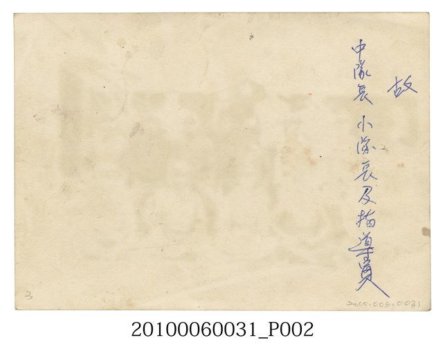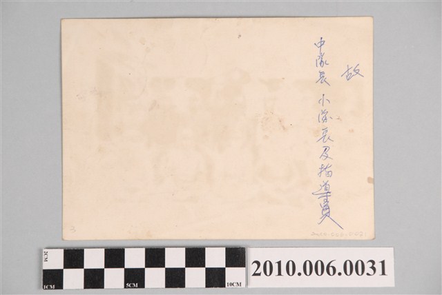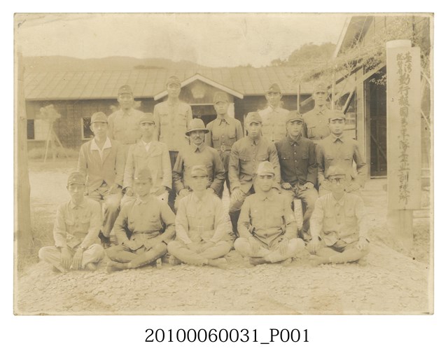 1.本物件為臺灣總督府勤行報國青年隊專業訓練所,故中隊長小隊長及指導員合影照片,右邊一立牌寫有「臺灣總督府勤行報國青年隊專業訓練所」字樣,照片中共有16名男性排成3排,均穿著襯衫及長褲。