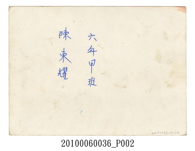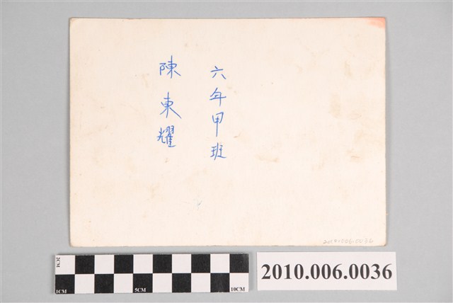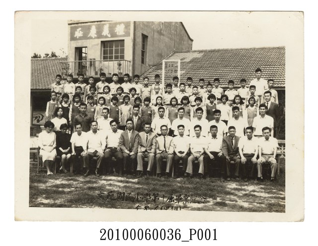 本件為苗栗縣苑裡鎮文苑國民小學第10屆畢業紀念照(甲班),後方校合牆上寫有:「禮義廉恥」,拍攝時間為民國58年(1969)6月。背面有手寫「六年甲班陳東耀」字樣。