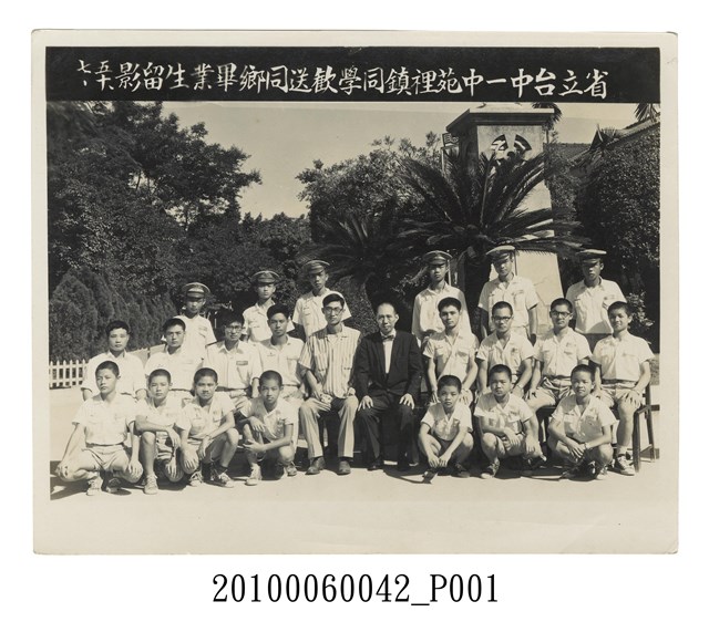 本件為臺灣省立臺中第一中學苑裡同鄉歡送同鄉畢業生紀念照,拍攝時間為民國50年(1961)7月,拍攝地點為臺中一中校園內。