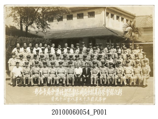 本物件為彰化縣警察局閻分局缷任梁分局長就任,員林分局全體同仁於局前合影照片,照片中約有75人,當時警察制服樸素單調也可看出當時臺灣社會的變化。