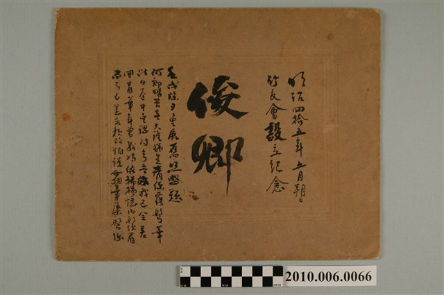 本件為竹友會設立會紀念照,拍攝時間為明治45年(1912)5月,照片正面印有:「竹友會設立會員紀念撮影」字樣,背面則有書法題字:「俊卿」二字。照片內共有男學生15名,穿著制服及制服正帽。