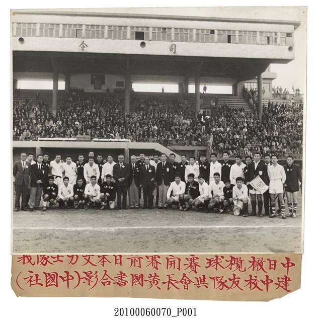 1.本物件為中日橄欖球賽開賽前日本文力士隊及建中校友隊與會長黃國書合影照片,圖終身著黑衣的球員為建中校友隊,白衣為日本橄欖球社會組球隊東京艾力士,正中央著西裝為當時橄欖球協會會長黃國書先生,地點為臺北市體育場。照片下方黏有以紅筆由左至右書寫「中日橄欖球賽開賽前日本文力士隊我建中校友隊與會長黃國書合影(中國社)」之紙條。