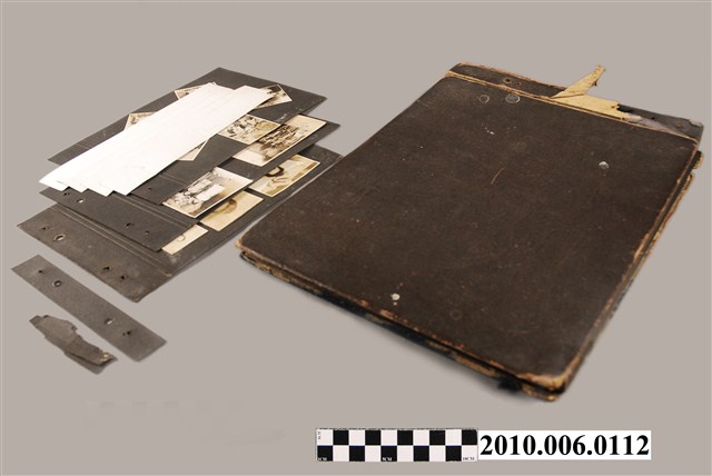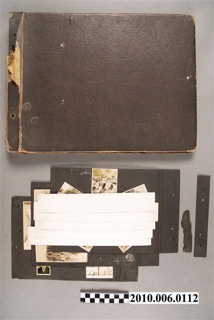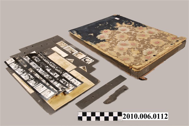 1.本物件為華南銀行相冊,其外部材質為紙質,整體底色為黑色。正面封面設計為花朵樣式,花朵中間為紅色花蕊圖示。背面則為全黑底樣式。