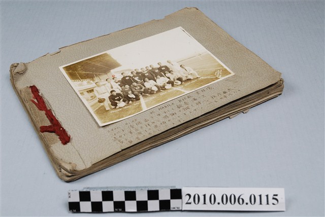 1.本物件為廖漢水運動寫真簿,為一本相簿,其正面封面已損毀,相簿材質為紙質,背面亦為同樣材質,無任何照片或圖案,但本相簿已多處凹折,於正面之左側、背面之右側以紅色棉線綁住固定,其內容以前往菲律賓、香港進行旅行與田徑比賽為主,有諸多與他人合照或他人之相片,亦有風景照。