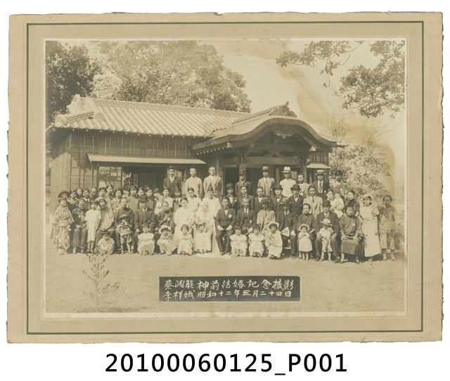 本物件為蔡淵能李祥娥神前結婚紀念攝影,為黑白照片,照片圖中右方多為男性;左方多為女性,男性多頭戴帽著西服,除可看出當時男女婚嫁雙方親友之穿著服飾外,其背後木構造建築樣式之神社,也清晰可見。。照片下方印有黑底白字「蔡淵能李祥娥神前結婚紀念攝影」、「昭和12年3月24日」。