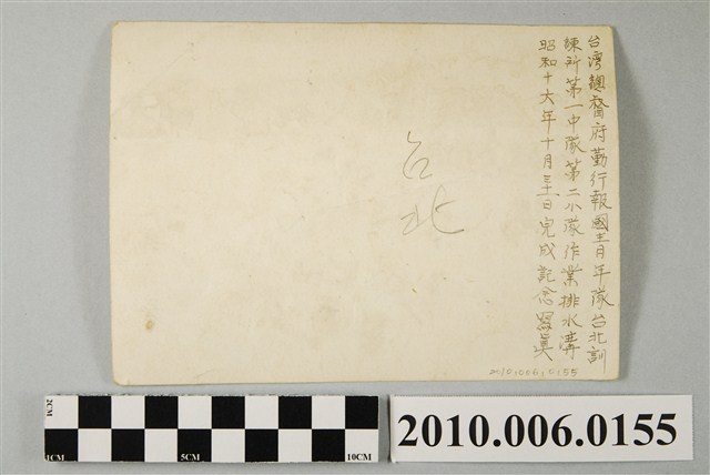 本物件為一張黑白照片,照片中約有58人,皆為男性,頭戴著帽子,身穿白色襯衫配上卡其色長褲,手上拿著處理排水溝用的工具,正在作業。拍攝時間為1941年10月31日,內容呈現臺灣總督府勤行報國青年隊臺北訓練所第一中隊第二小隊作業排水溝之剪影。場景為戶外,一大片草地,旁有幾棵大樹。照片正面以白字寫上「臺灣總督府勤行報國青年臺北訓練所記念」,照片背面則有附註「臺灣總督府勤行報國青年隊臺北訓練所第一中隊第二小隊作業排水溝 昭和十六年十月三十一日完成記念寫真」。照片本體稍為泛黃,無特別明顯汙漬。