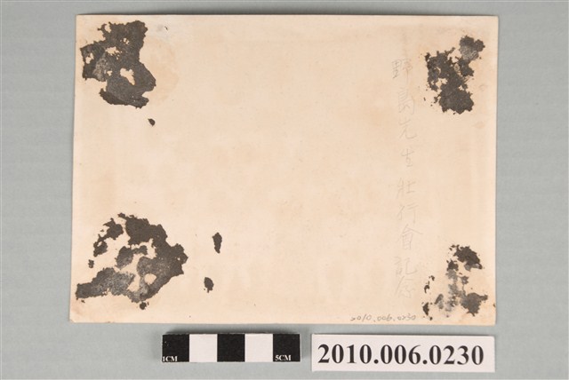 本物件為一張黑白照片,總共有37人,中間兩排集中為女性,有19人,其餘皆為男性。服裝以淺色為主,男性皆戴著帽子,款式有軍帽也有軍常服用的帽子。場景為戶外,旁邊有個旗幟,為送別野島先生的旗子。拍攝時間為1943年10月27日,照片背景為一棟日式木造樣式之建築。照片上方有黑底白字「野島先生應召壯行會記念 昭和十八年十月廿七日」。照片背面四角有黏貼痕跡,並有用鉛筆寫上「野島先生壯行會記念」。