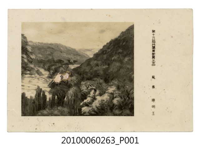 1.本物件為第16屆臺陽美術展出品陳明玉風景之照片,材質為紙,為黑白照片,圖中的山野風光應為陳明玉所繪的風景,圖繪右側印有黑字「第16屆臺陽美術展出品風景陳明玉」。