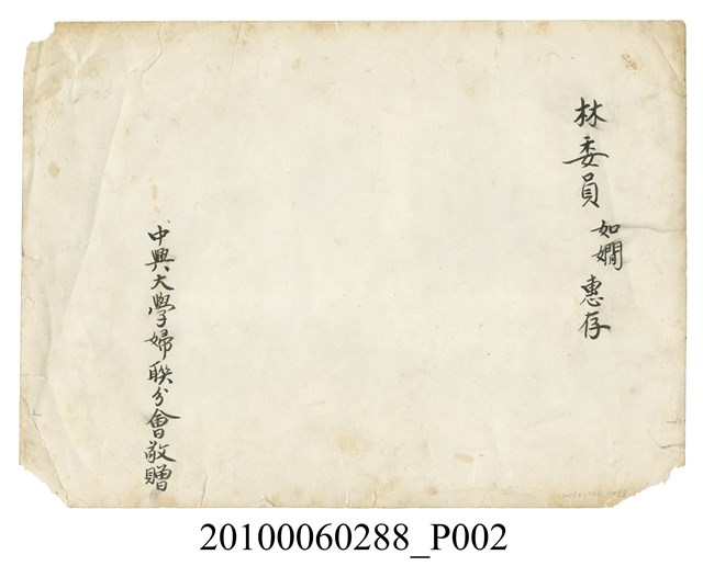 此物件為黑白合照,為「中華婦女反共抗俄聯合會省立中興大學分會迎新大會合影紀念」,拍攝日期為1963年11月7日。相片背面有「林委員如嫺惠存」、「中興大學婦聯分會敬贈」字樣。 中華婦女反共抗俄聯合會,為中國國民黨於1950年所創辦的婦女組織,創辦者為蔣宋美齡,主要工作在於團結全國婦女、軍眷族群,其重要幹部多為國軍將領夫人。宋美齡在 1950年代整合婦女界的民間力量,先於1950年創設民間團體「中華民國婦女聯合會」,而後透過中國國民黨設立「中國國民黨中央婦女工作會」,領導、動員國內婦女之功效。中華婦女反共抗俄聯合會於1964年更名為中華婦女反共聯合會,而後又於1996年改名為中華民國婦女聯合會。該會曾於1990年申請立案為政治團體獲准,但未依《政黨法》規定如期進行章程修正,轉型為政黨,因而在2020年遭內政部廢止立案。