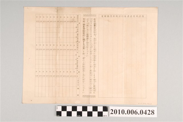 本件為昭和13年(1938)6月14日,溫聰明投保之保險證書,編號養台第參參七○○七號。在此證書中載明溫聰明理賠額度為156圓,投保種類為15年期滿養老保險,投保金額為1圓。保險金繳交期限與保險終了時間皆為昭和28年(1953)6月13日;受益人為溫銅。