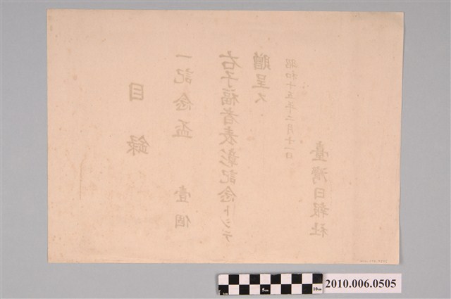 本件為昭和15年(1940)2月11日臺灣日報社發給紀念盃贈與證明,因表彰而贈送一個記念盃。臺灣日報前身為臺南新報,明治32年(1899)創立,社址位於臺南,昭和12年(1937)改名為臺灣日報。