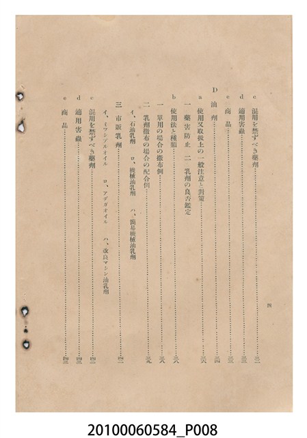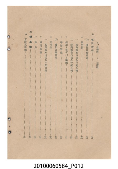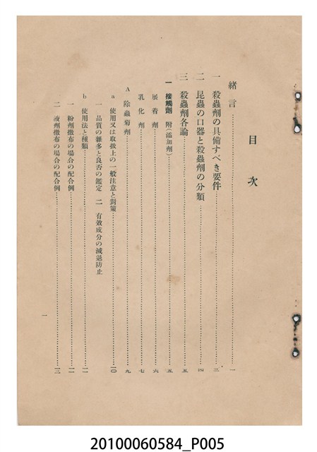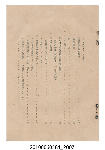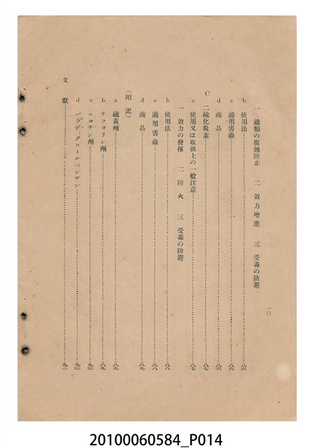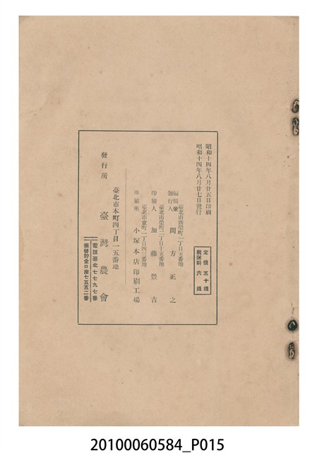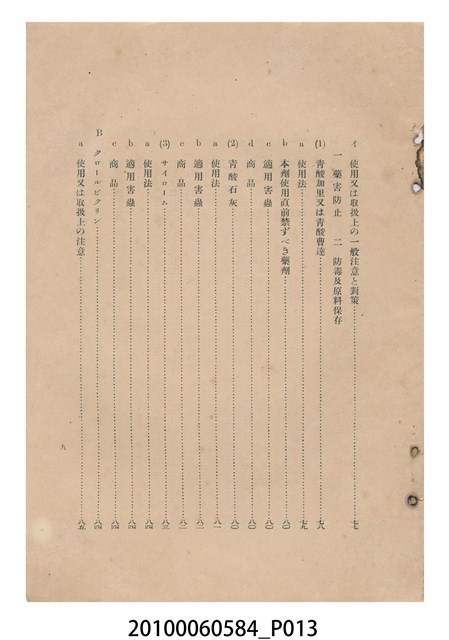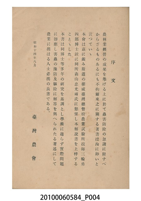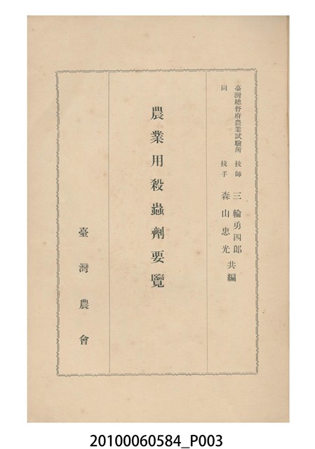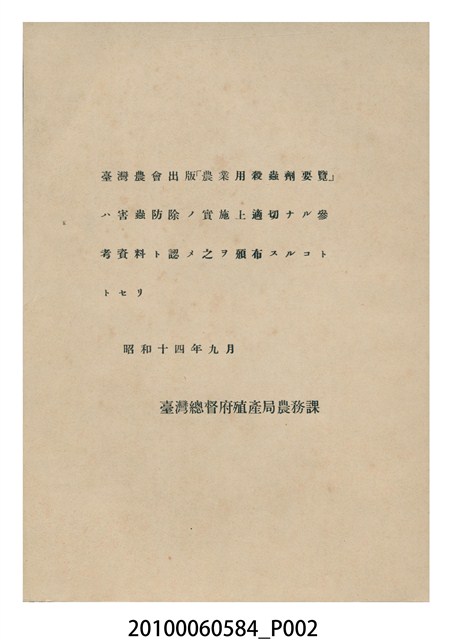 本物件為農業用殺蟲劑要覽,由間方正之編著,臺灣農會出版發行於昭和14年8月27日。內容介紹臺灣在日治時期使用殺蟲劑的詳細種類、使用條件、使用方法以及適用的害蟲。