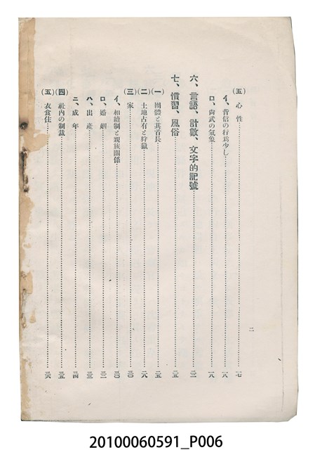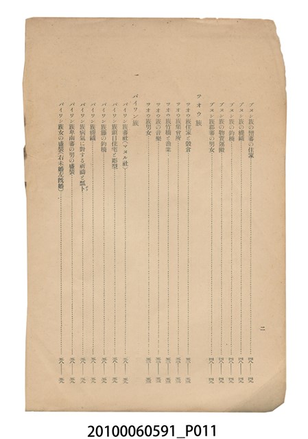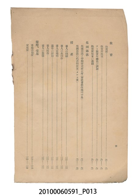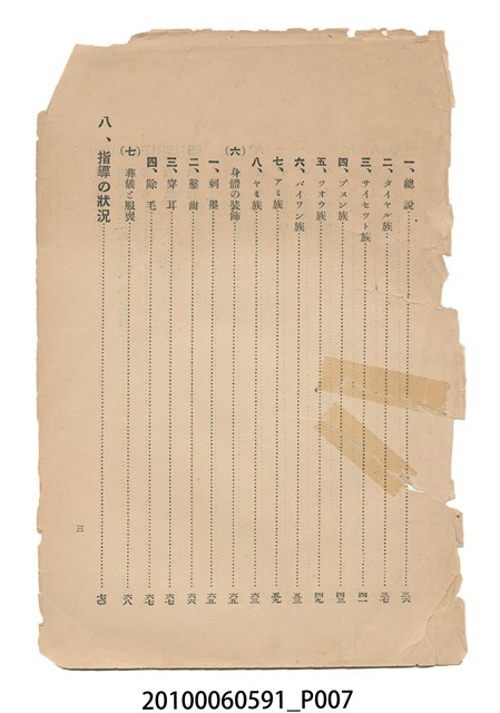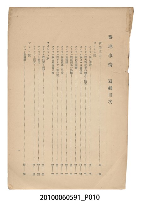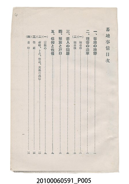 本件為日本時代的書籍,由盛文社印刷、臺灣總督府警務局理蕃課編纂與發行。本書為右翻式書籍,因年代久遠部分內頁已脫落。書中共分9個章節,其內容以臺灣原住民的生活習慣風俗及語言文字為主,並附有1張臺灣原住民族種族別分布圖,以及105張清晰的寫真照片。各章節目次如下:一、蕃地の地勢。二、理蕃の沿革。三、蕃人の閱歷。四、種族と戶口。五、信仰と性情。六、言語、計數、文字的記號。七、慣習、風俗。八、指導の狀況。九、蕃地開發調查。