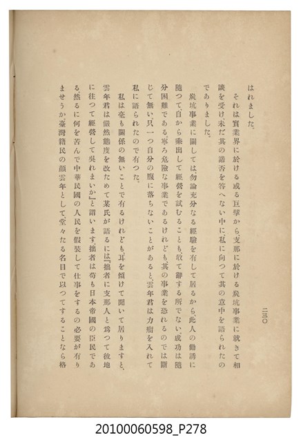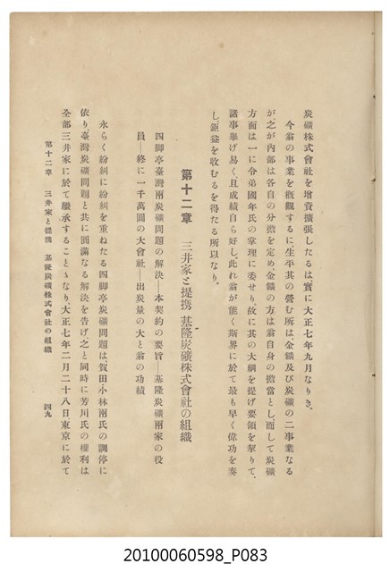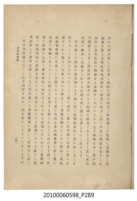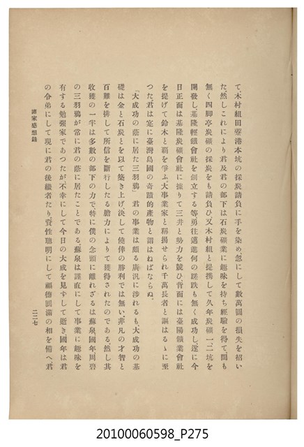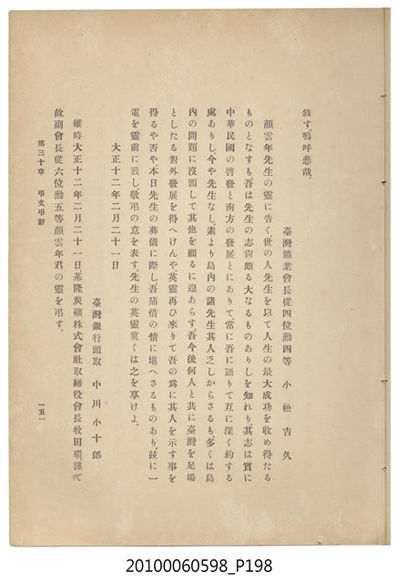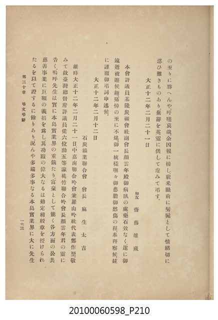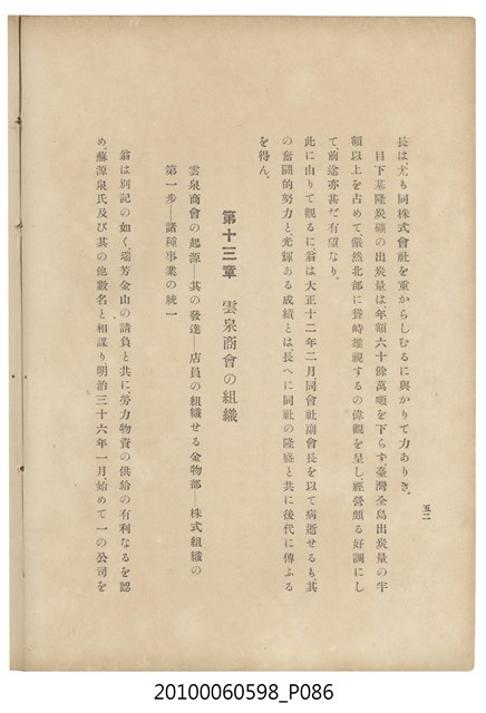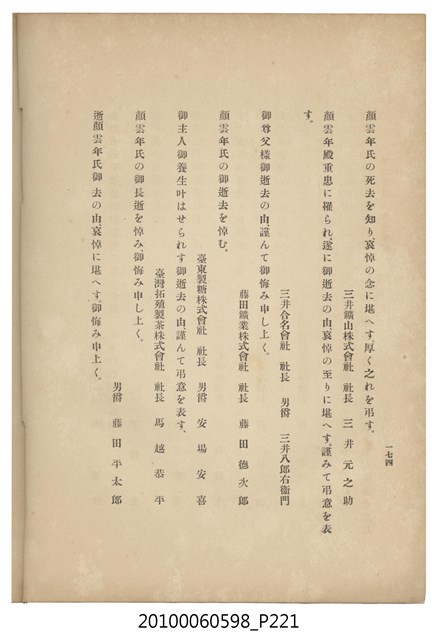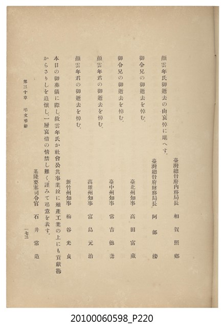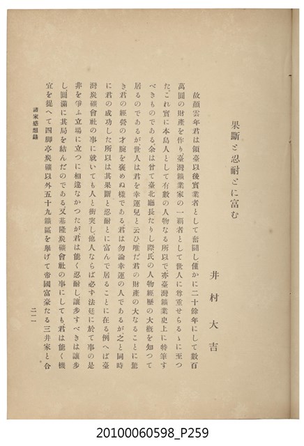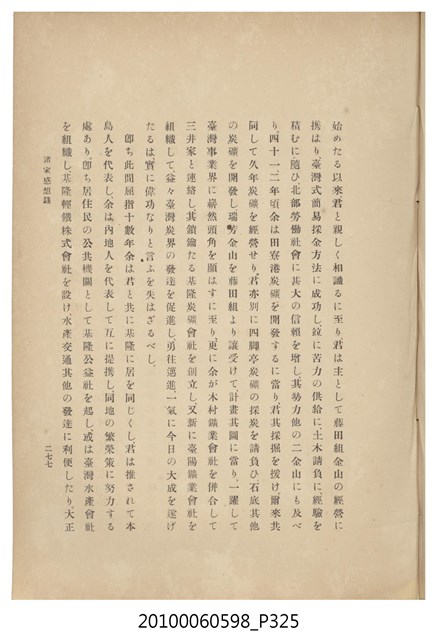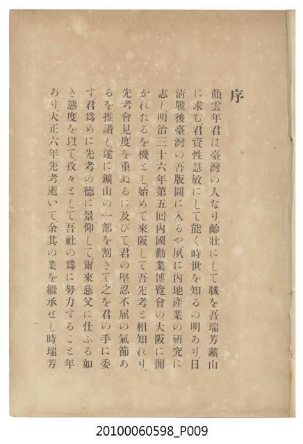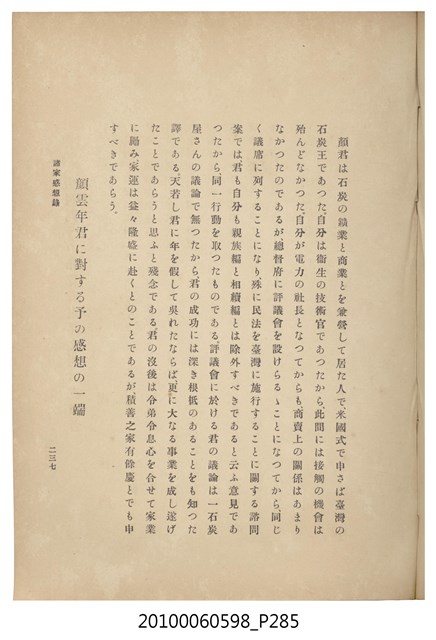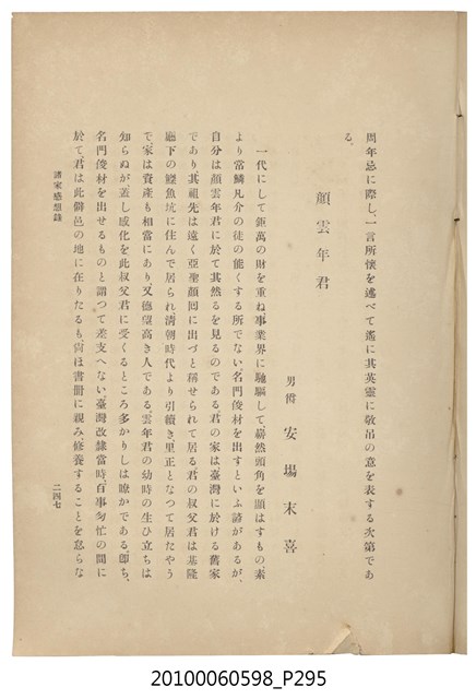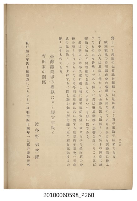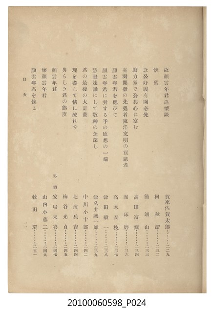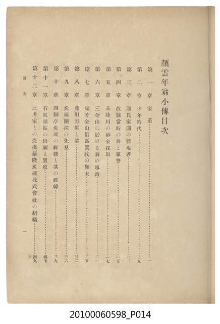 臺灣五大家族之基隆顏家及顏雲年不同年齡照片,及基隆炭礦株式會社創立○陽公司控煤各式照片四十張,及顏雲年弔儀式場案內,內容大致如臺灣礦業發展史,由友聲會編纂,介紹顏雲年翁的一生。