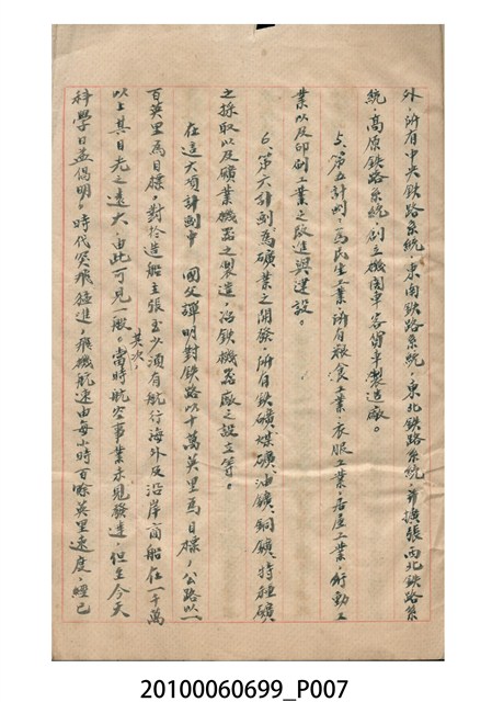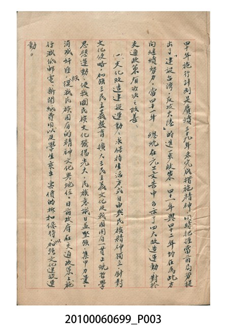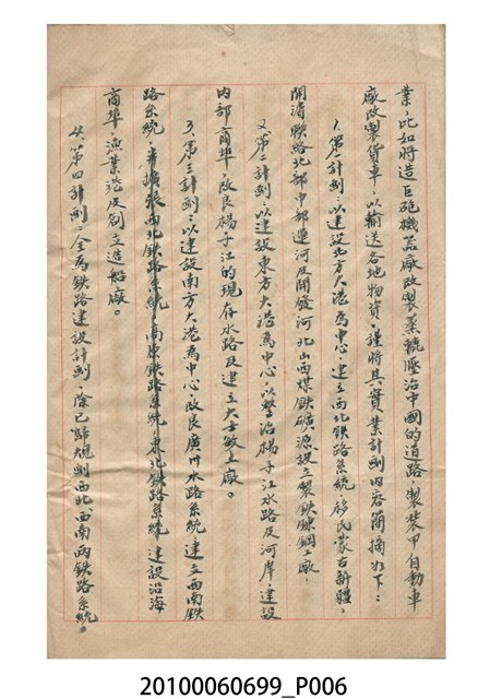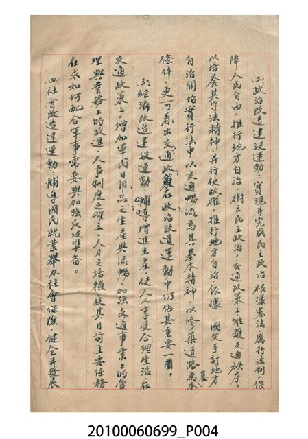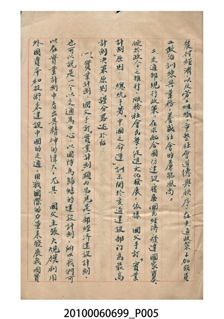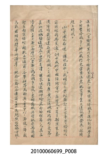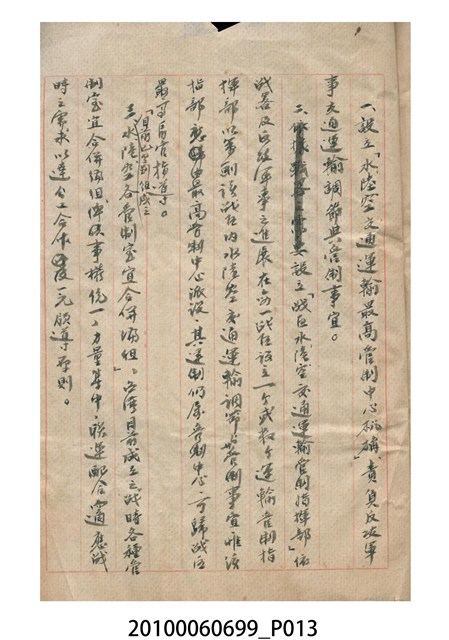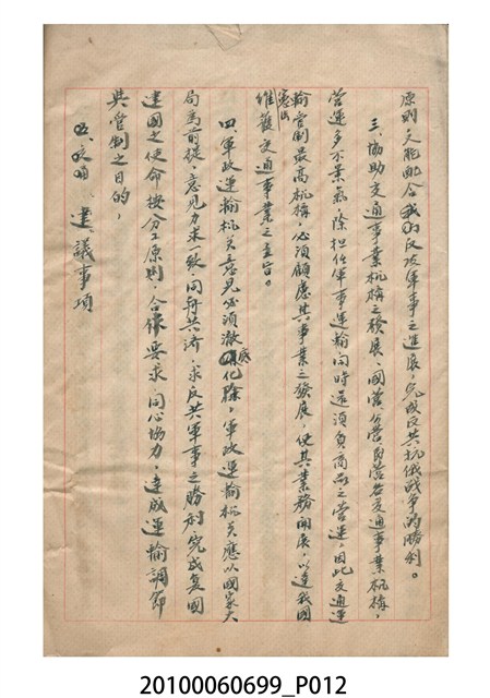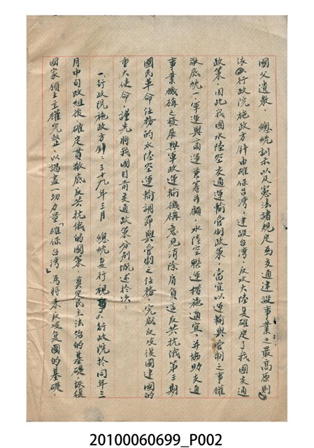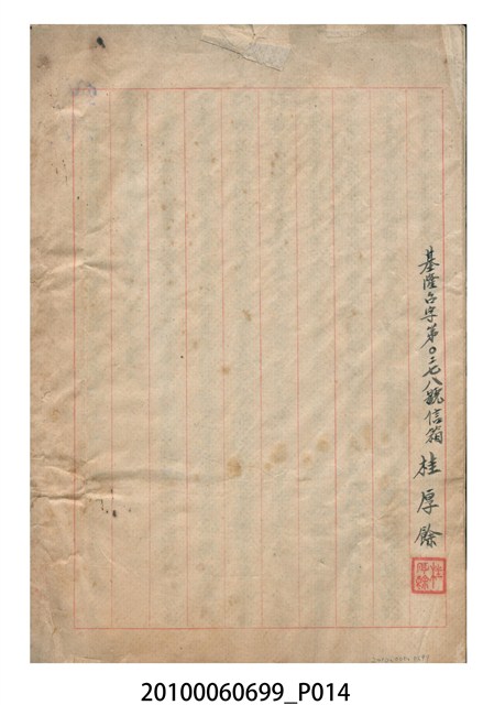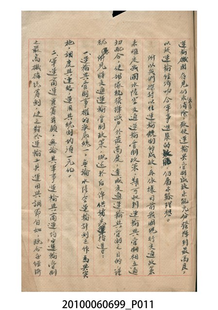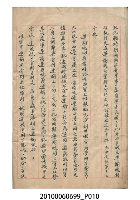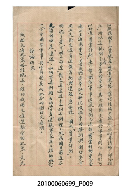 本物件為我國水陸空交通運輸管制政策研究,紙質文物。本物件為桂厚餘之手書資料,由物件正面可見「我國水陸空交通運輸管制政策研究」、「桂厚餘」字樣,共14頁。物件末頁可見「基隆台字第○二七八號信箱 桂厚餘」字樣,附上1個「桂厚餘」之朱紅色方形印章。