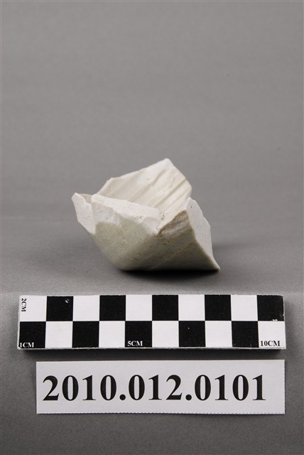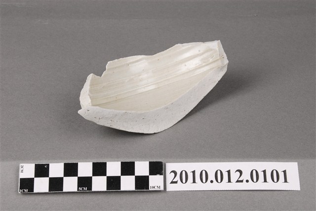 白瓷罐(安平壺)口殘片。薄胎,內外施釉,灰白釉淺,呈色偏白且略帶冷色調光澤,胎色潔白細緻,其中參雜些許微粒。器表素面無紋飾。此殘片應是安平壺器肩與器身連結的部位,可見較方的轉折處。由殘片側面的胎來看,可發現越靠近壺頸、壺口連接處的胎厚度逐漸加厚,口部厚胎是安平壺的特色之一。