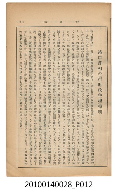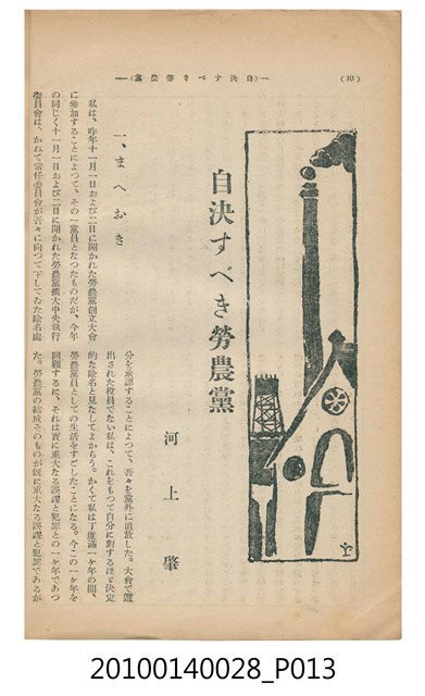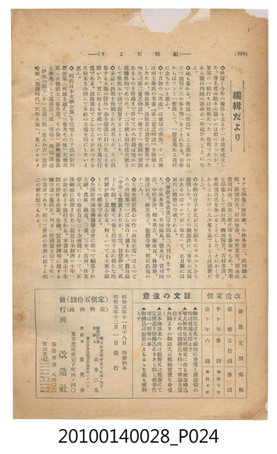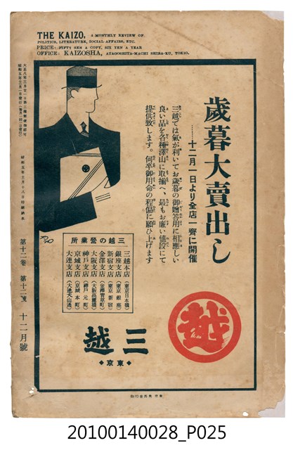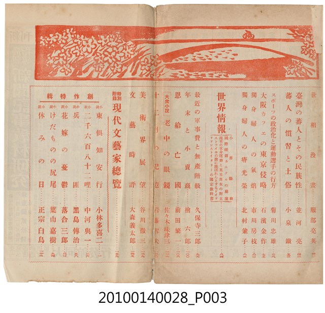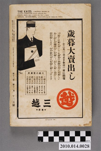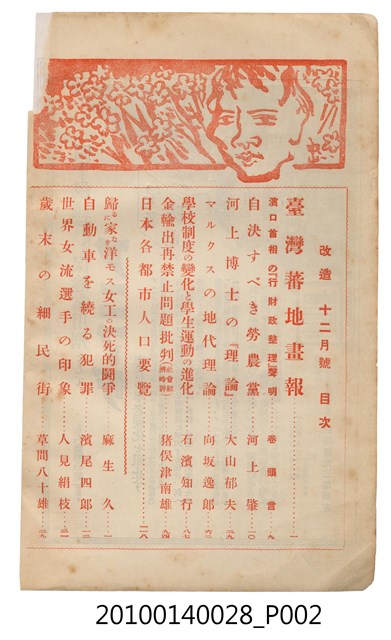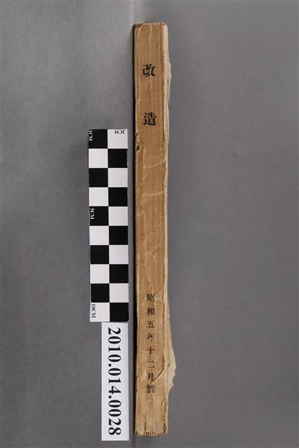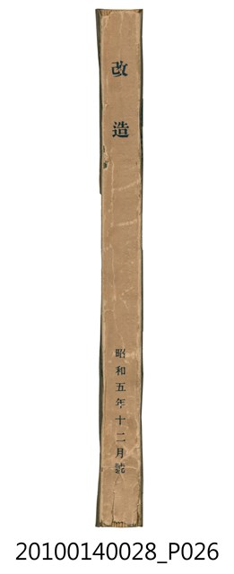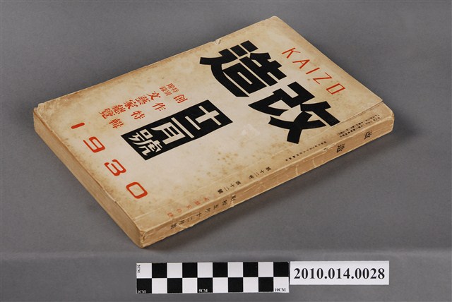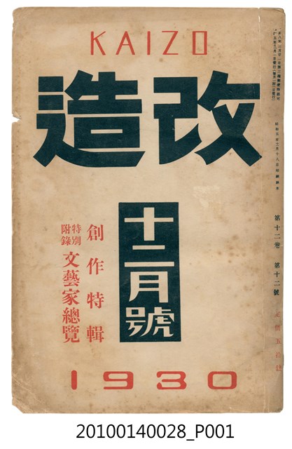 此物件為一紙質雜誌,於1930年(昭和5年)11月18日,由改造社出版的《改造》雜誌第12卷第12號12月號。 此《改造》雜誌由日本東京的改造社於1919年創辦,在日本「大正民主潮」的潮流下創辦,為有著社會主義傾向的綜合性雜誌,主要刊載勞工及社會問題,許多左派的學者都曾在上面發表論文,與偏自由主義的「中央公論」一起被認為大正民主潮下重要的兩份雜誌。 大正民主潮始於1905年的「日比谷燒打事件」,此事件為民眾不滿日俄簽訂的講和條約,而在東京日比谷公園發起示威活動,在此事件下間接促成非軍閥出生的西園寺公望擔任首相,大正民主潮於是開始。大正民主潮促成日本國內社會主義、自由主義等等思潮百家爭鳴,而民眾更加積極參與政治,以集會遊行的方式表達自己的訴求。另外在殖民地方面,朝鮮於1918年發起「三一事件」後,日本產生對於殖民地政府統治過於嚴苛的批判聲浪,因而漸接促成臺灣總督府由文官出任以及臺灣地方自治制度的出現,另外在日本的臺灣留學生也因此爭取臺灣自治,最終導致「臺灣文化協會」的誕生。