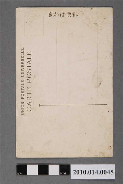 1. 本物件為以竹筏為主題的明信片。正面為竹筏的黑白照,使用約12根圓竹紮成,中間立有幃桿,船帆呈收起狀態。中間設有一圓筒,可供乘坐或放置貴重物品。右上方有一吊掛半空的小船。下方印「臺灣南部竹筏」、「(240)(TETTSUPAI)RANBOO RAFF, FORMOSA.」。背面為書寫面,右上角為郵票黏貼處,右側印「郵便はかき」。上方印「UNION POSTALE UNIVERSELLE.」、「CARTE POSTALE」。中有一T字形分隔線,分隔線右方有四行虛線供書寫對齊。2. 竹筏是以竹、木等平擺編紮成的水上交通工具。臺灣原住民很早就利用竹子編筏以渡河川。此外,筏亦被用來做為近海漁業用的交通工具。18世紀時的臺灣竹筏已裝上中國式的篷帆,行駛於海上,稱為航海帆筏。