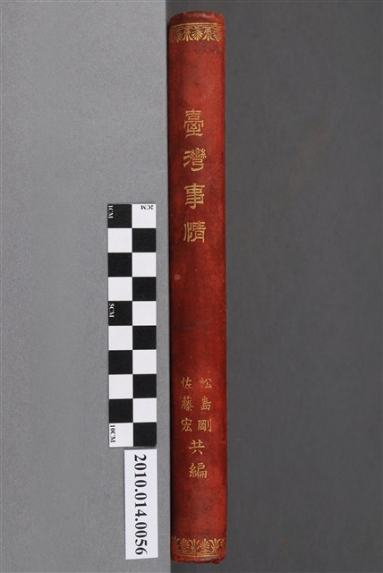 本物件為松島剛等著《臺灣事情》,作者為松島剛與佐藤宏共編,書本扉頁處為紅色,其餘為黑色書皮。該書出版於明治30年(1897)2月4日,由春陽堂出版,因應日本初領臺灣,對臺灣島了解甚少,為充實經營臺灣的基礎知識而做,主要介紹臺灣歷史、地理、地質、動植物、人種、風俗、宗教、產物、產業等資訊。