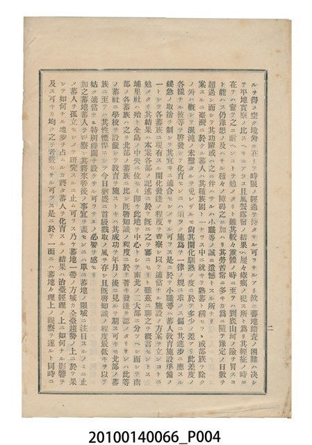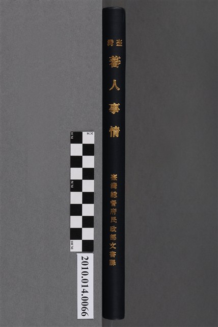 1.本書裝幀採黑色書皮精裝,書脊印有燙金書名,於明治33年(西元1900年)3月20日印刷,明治33年3月25日發行,著作人為伊能嘉矩,發行單位為臺灣總督府民政部文書課,印刷所為臺灣日日新報社。2.本書為臺灣總督府民政部委託伊能嘉矩進入臺灣各地原住民地區進行田野調查後,撰寫出的《臺灣蕃人事情》。書中共分「蕃俗誌」、「蕃語誌」、「地方誌」、「沿革誌」及「結論」共5篇,其中伊能嘉矩將臺灣原住民族分為8族,為臺灣原住民族群分類之先驅,同時紀錄原住民各族的地理分布、族稱、部落名稱、戶口人數、社會組織、習俗。此外