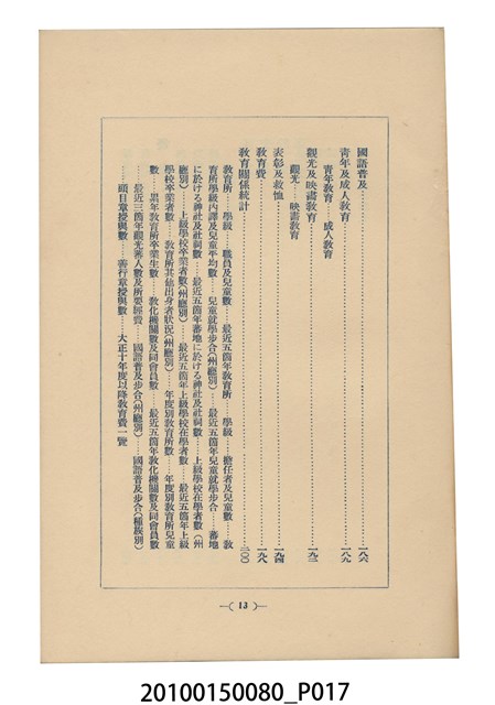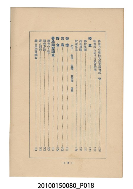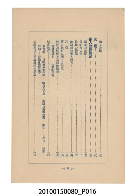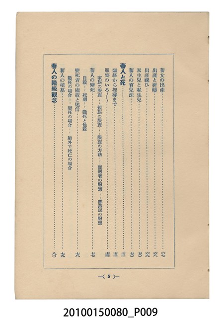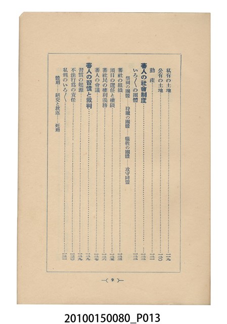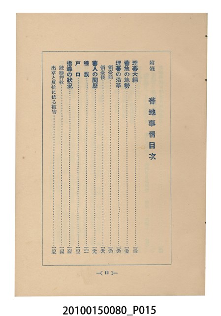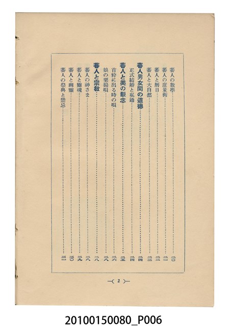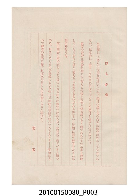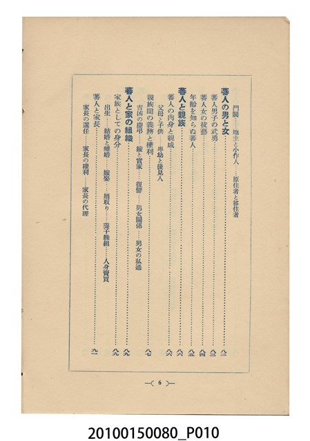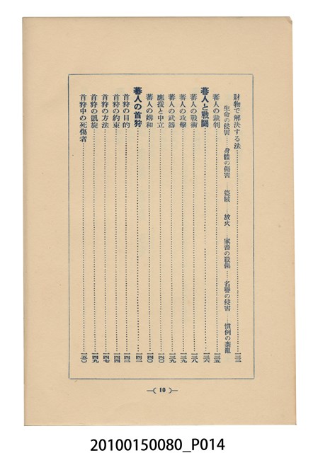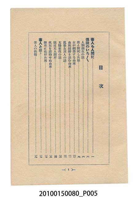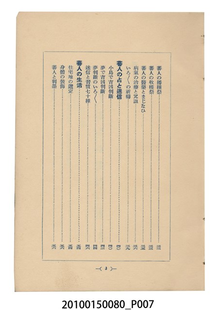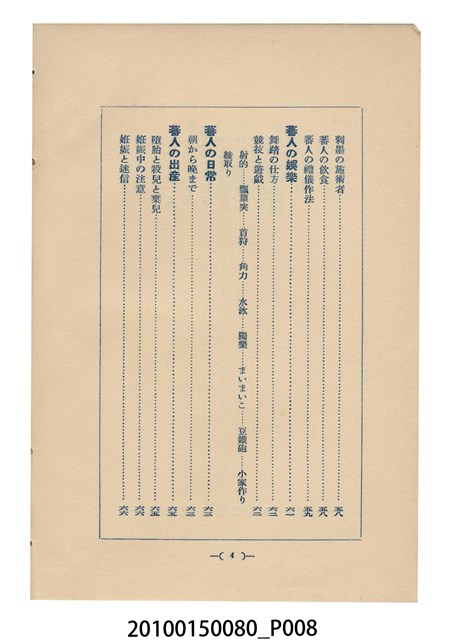 本件為日本時代的書籍,由田上忠之著作、吉村商會印刷所印刷、臺灣蕃族研究所發行。書中共分為22個主題,以介紹臺灣原住民的生活習慣風俗與傳說為主,內容包括原住民的各種創生神話、傳說、道德、審美觀、宗教、迷信、生活、娛樂、育兒、喪禮儀式、階級觀念、親族、家庭組織、婚姻、財產、社會制度、慣習法、戰爭、首狩等,是當時官方政府與學者對原住民的田野調查紀錄成果。書內附有1張臺灣原住民族種族別分布圖以及數張黑白寫真照片,書末以「蕃地事情」作為附錄。書中目次如下:蕃人の生活、蕃人の娛樂、蕃人の日常、蕃人の出產、蕃人と死、蕃