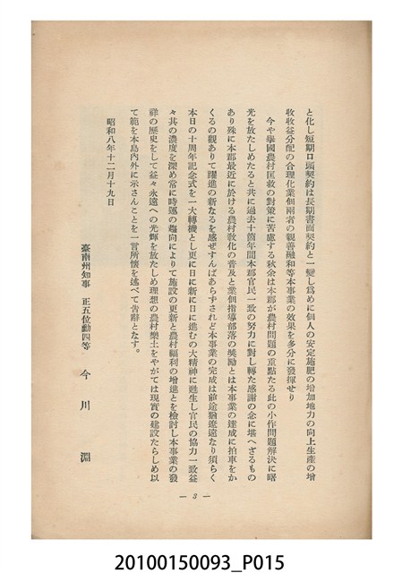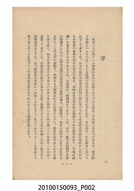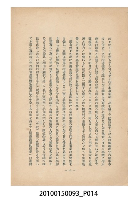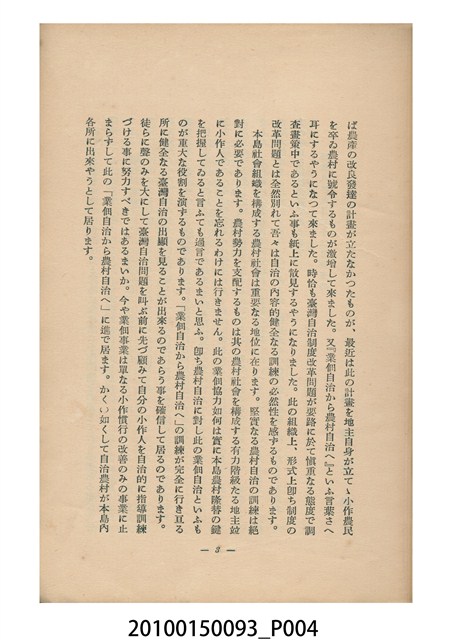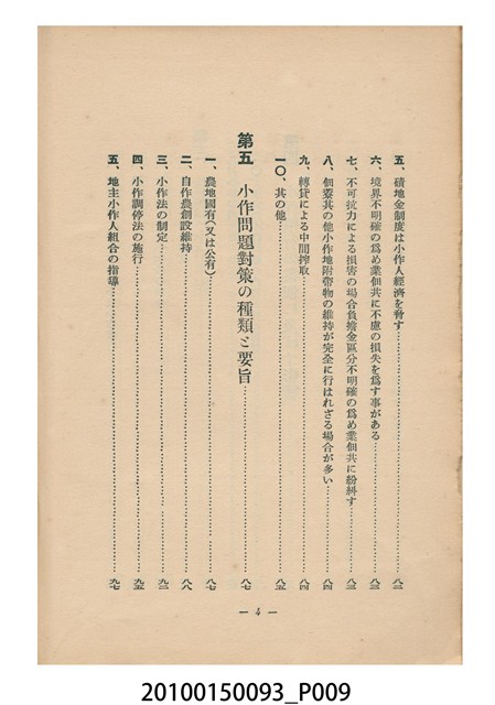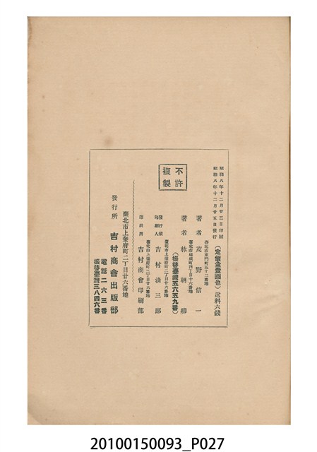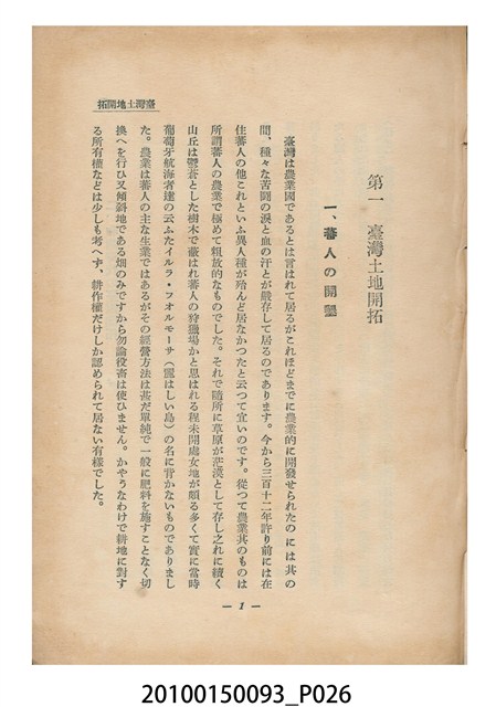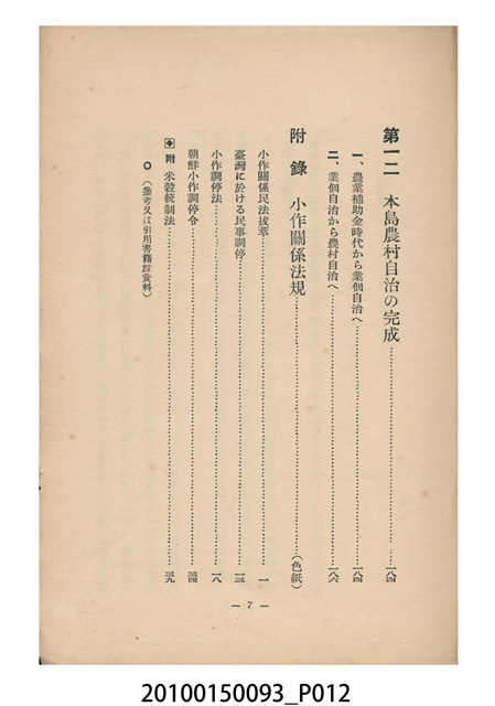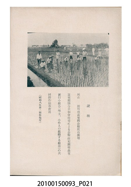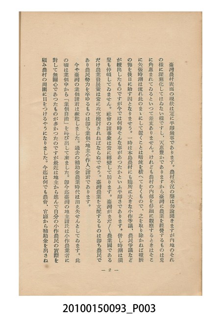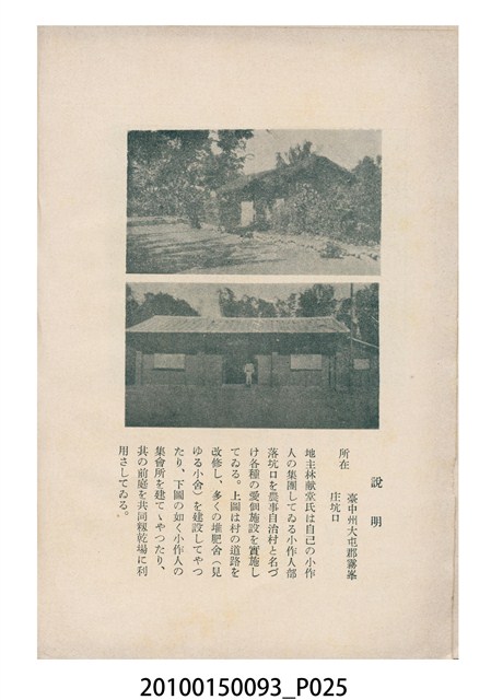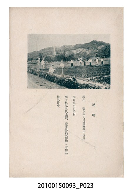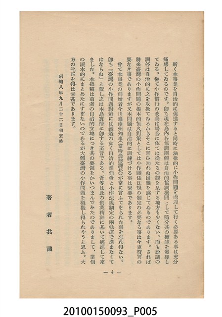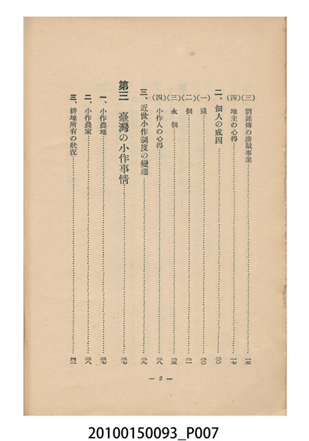 本物件為臺灣的小作問題,由茂野信一和林朝卿共同編著,吉村商會出版部於昭和8年12月25日發行。「小作」為佃農、自耕農之意。該書介紹臺灣農業問題及發展,包含臺灣土地的開墾與土地制度發展,大小租戶與佃農的形成,小作農業的發展與影響等。本件與登錄號2010.006.0578藏品相同。