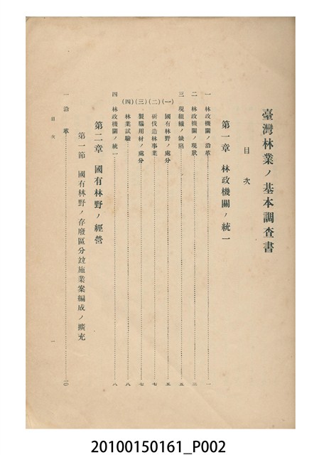 本物件為臺灣林業基本調查書,由臺灣總督府殖產局編著,於昭和6年5月20日出版,為殖產局出版第598號。該書以臺灣林業為核心,提及了林政機關的統一、國有林的經營、伐林、造林、保安林的整備、民有林的經營等。