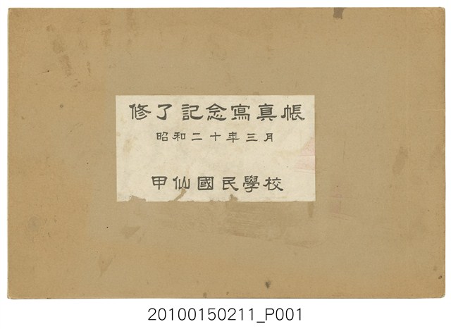 本件為甲仙國民學校結業紀念冊,製作時間為昭和20年(1945)3月,黑白印刷。內容包括教職員合照、課堂照、農業實習照、體操照等。甲仙國民學校(今高雄市甲仙國民小學),其前身為1907年創立之「蕃薯藔公學校阿里關分校」,1911年改稱「蕃薯藔公學校甲仙埔分校」。1921年,甲仙埔分校獨立為「甲仙公學校」,1941年配合國民學校令的施行,又改稱「甲仙國民學校」,校名沿用至戰後。該校名沿革,如下:1907年,蕃薯藔公學校阿里關分校;1911年,蕃薯藔公學校甲仙埔分校;1921年,甲仙公學校;1941年,甲仙國民學校;1968年,甲仙國民小學。