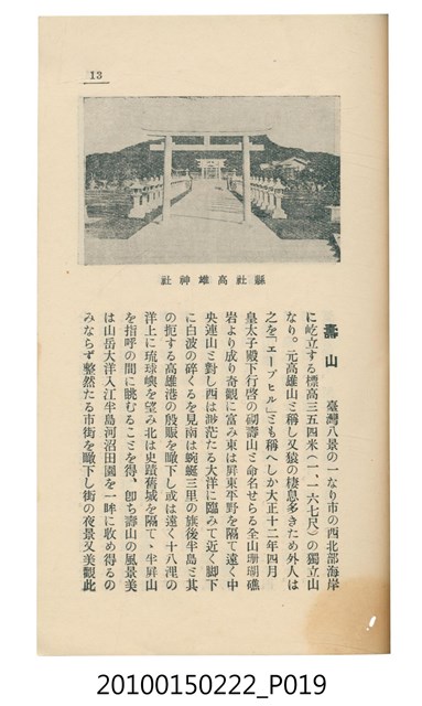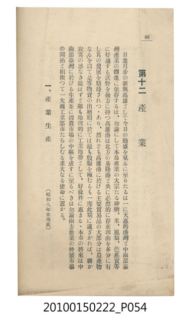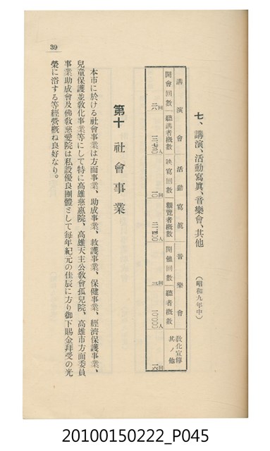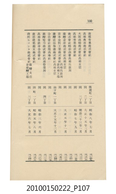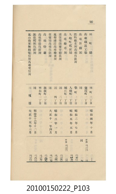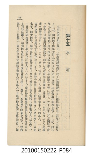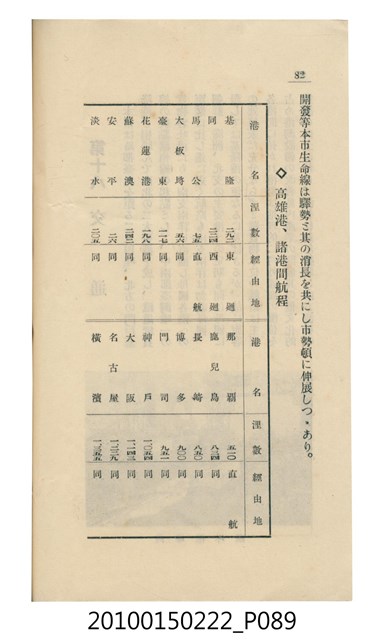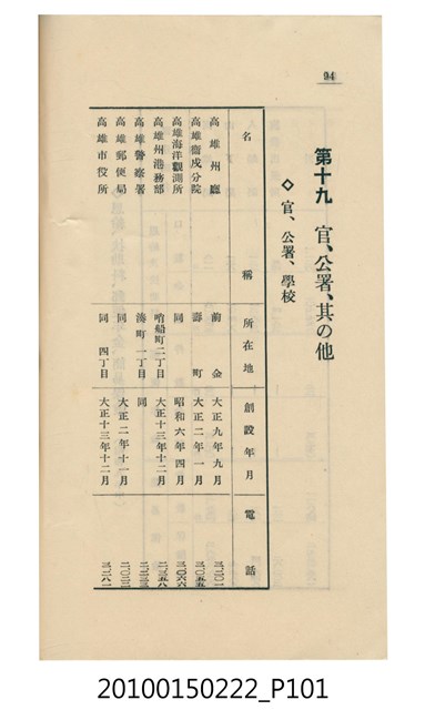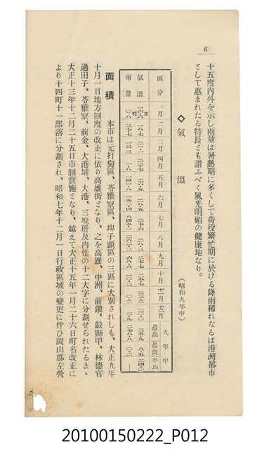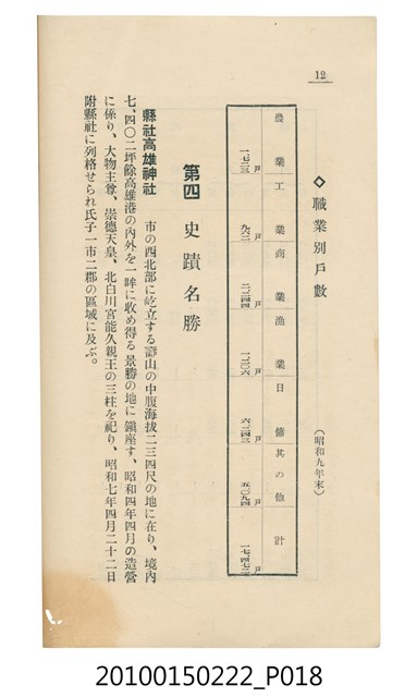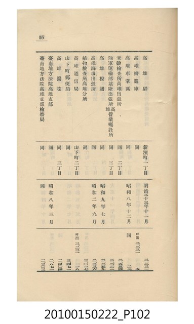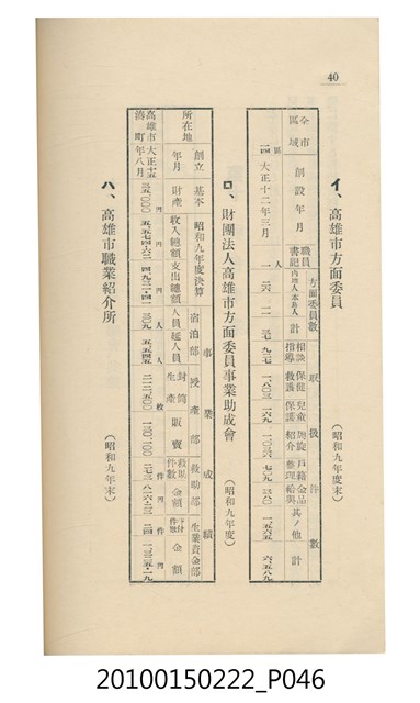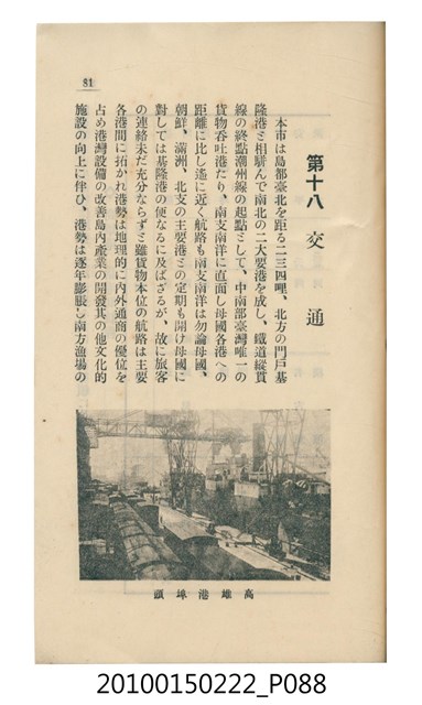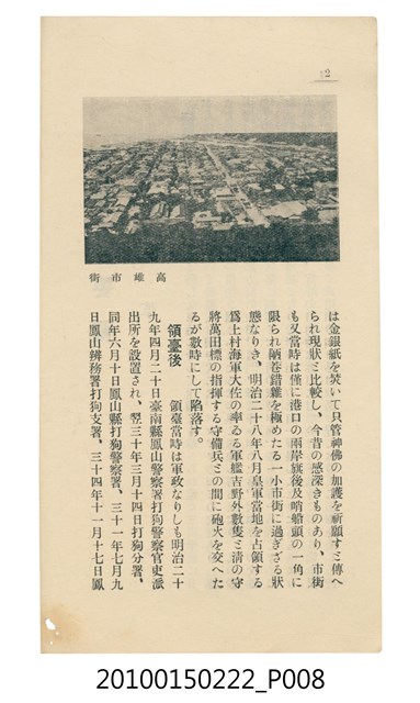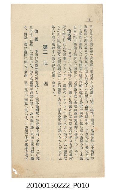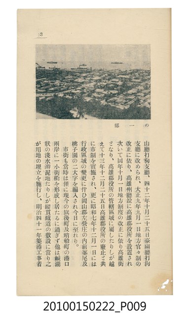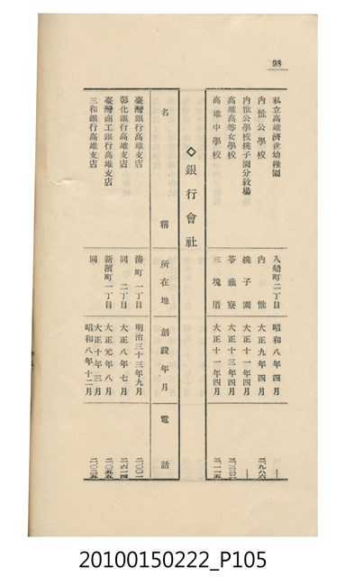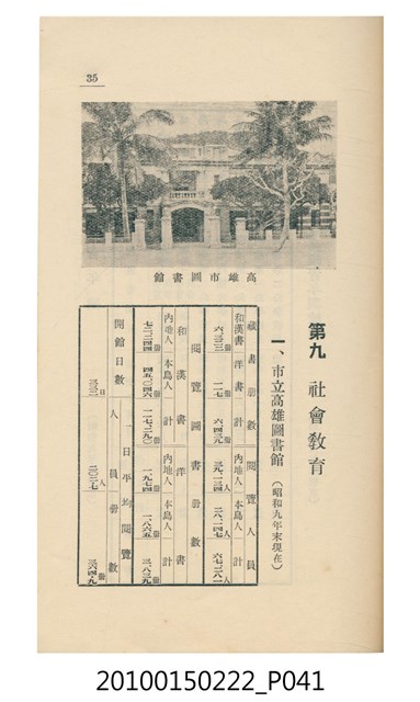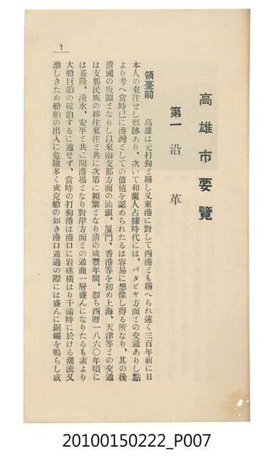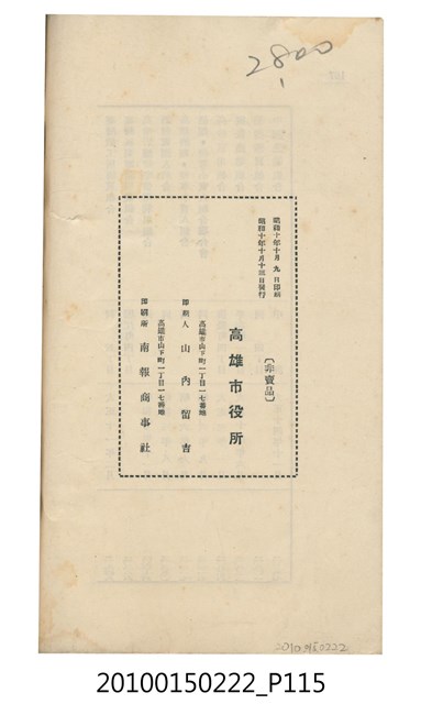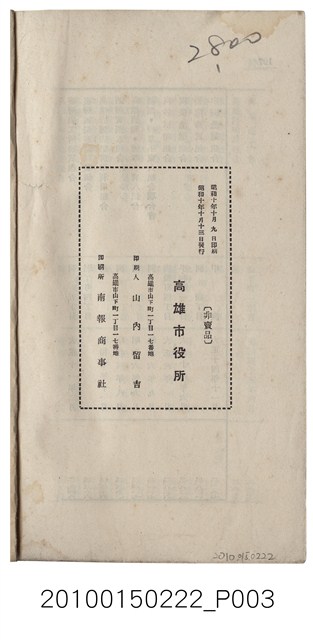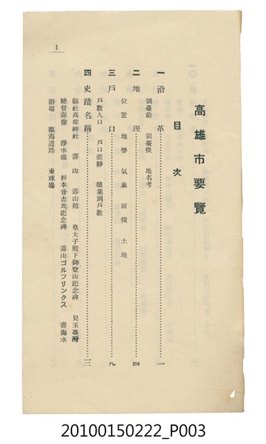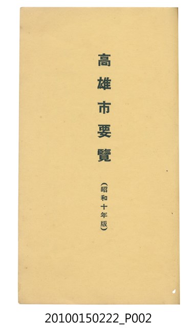 《高雄市要覽》,高雄市役所編纂,印刷所南報商事社,昭和10(1935)年10月13日發行。 本書是地方政府所做的地方導覽,內容包含沿革、地理、戶口、史蹟名稱、市政機關、財政、社寺宗教、教育、社會教育、社會事業、兵事、產業、金融貿易、保健衛生、水道、土木及營造、消防機關、交通、官公署及其他等19章,多統計資料,可作為地方研究的史料。