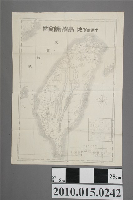 〈新領地臺灣島全圖〉,比例尺八十萬分之一,出版項未標示。圖名標「新領地」,研判為1895年中日議和之後製作的地圖。